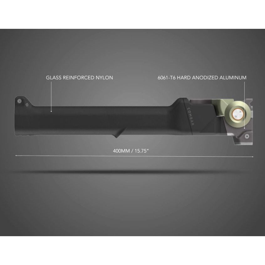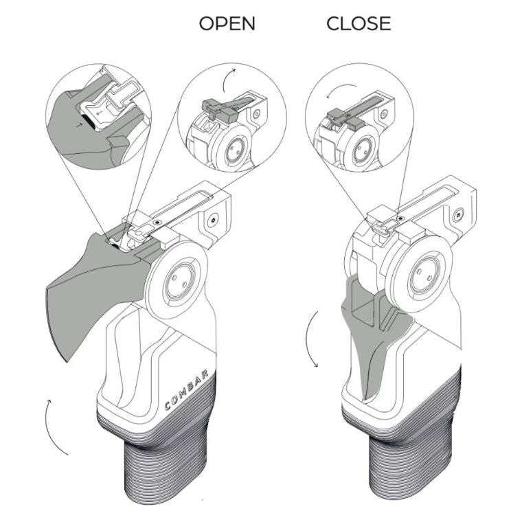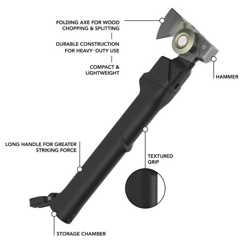 COMBAR™ FoldaXe is a powerful yet streamlined outdoor multitool for chopping, splitting, and hammering. It combines timeless tools with cutting-edge technology to create a first-of-its-kind folding axe and hammer. The glass-reinforced polymer handle provides the foundation. The cleverly engineered head allows the FoldaXe to transform from a stowed position to hammer to axe in seconds. Finally, the hollow, grip-textured shaft doubles as a storage capsule to house personalized, mission-specific kits.
