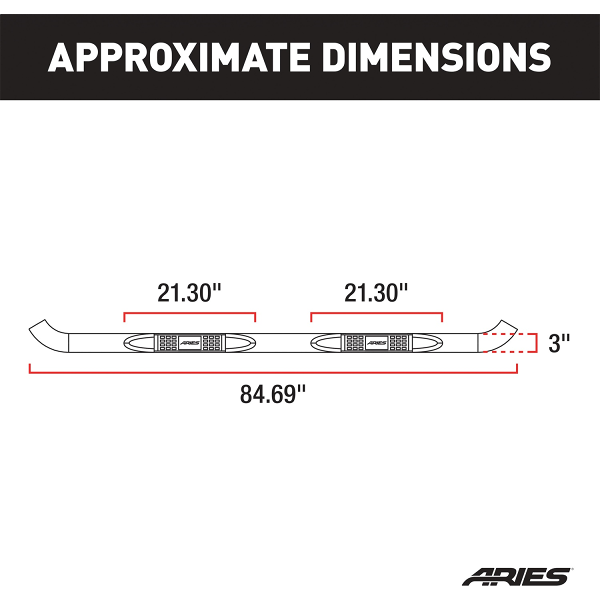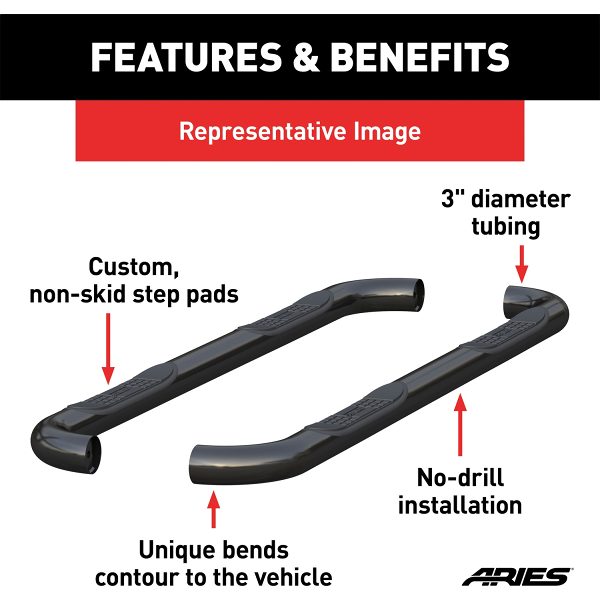 Get functional footing, a customized look and a highly rust-resistant construction with ARIES 3" round side bars. These side bars feature a unique, trail-ready build, a vehicle-specific contour, a no-drill install, and solid footing to climb in and out of your truck.