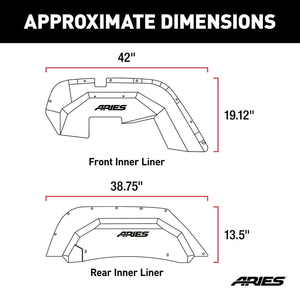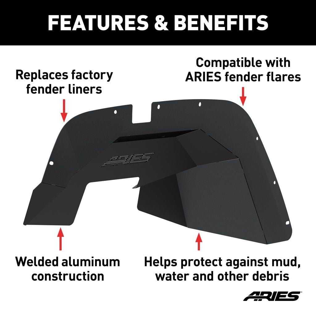 ARIES Jeep inner fender liners are the perfect accessory for the offroading Jeep Wrangler JK. These trail-ready fender liners feature a highly rust-resistant construction, an integrated design for maximum protection and a tough, aftermarket look. They are available for the front and rear, and they are the perfect complement to our offroad-style aluminum fender flares. This package includes two fender liners for the front, one for the driver side and one for the passenger side.