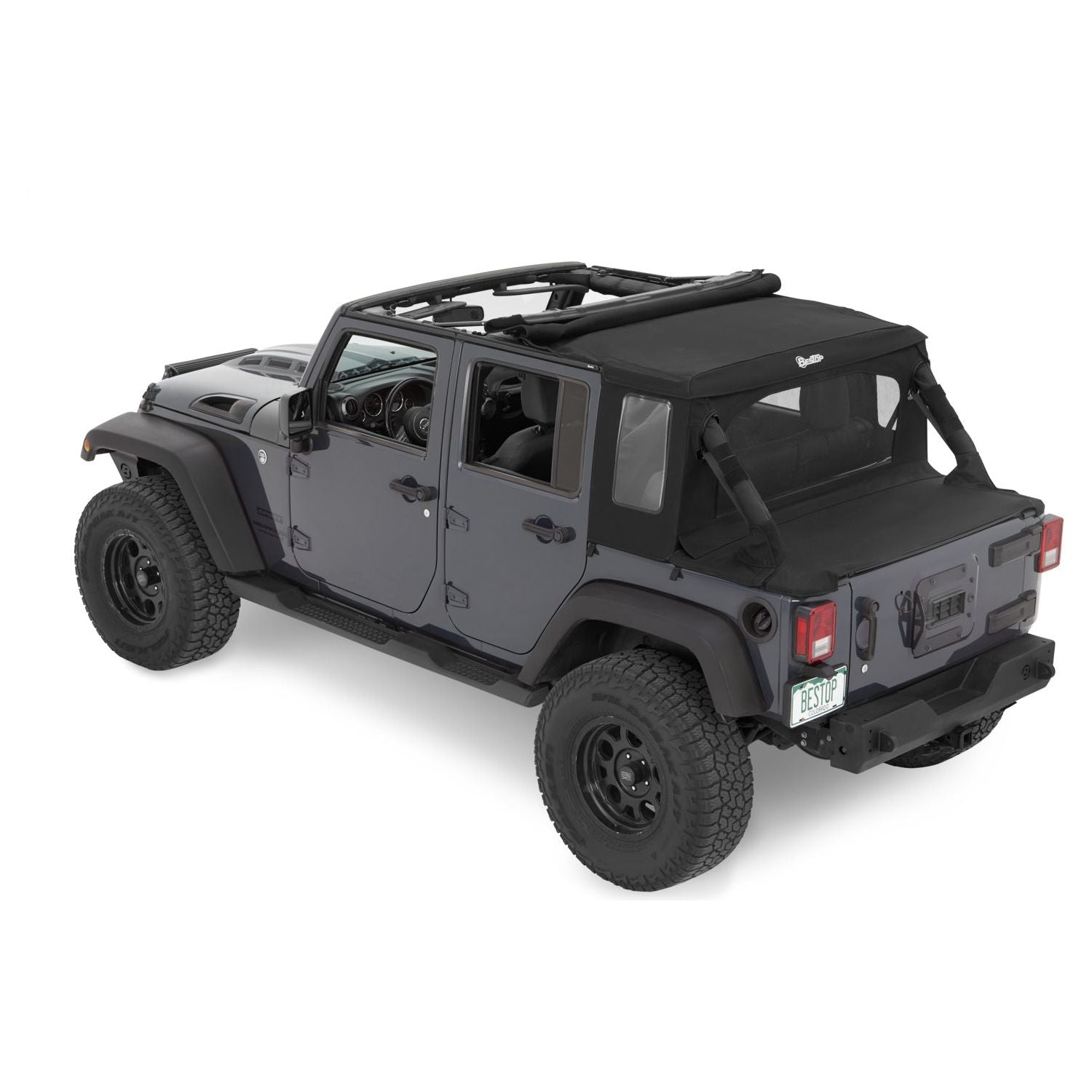 VEHICLE FITMENT: JK (4DR) 2007-2018 I Bestop Halftop Soft Top Conversion Kit Black Diamond Compatible w/56853-35 I Give your JK Wrangler an all-new look by adding this kit to an existing Trektop soft top. Modular design allows you to run all 3 components together or remove panels for an open-air experience.