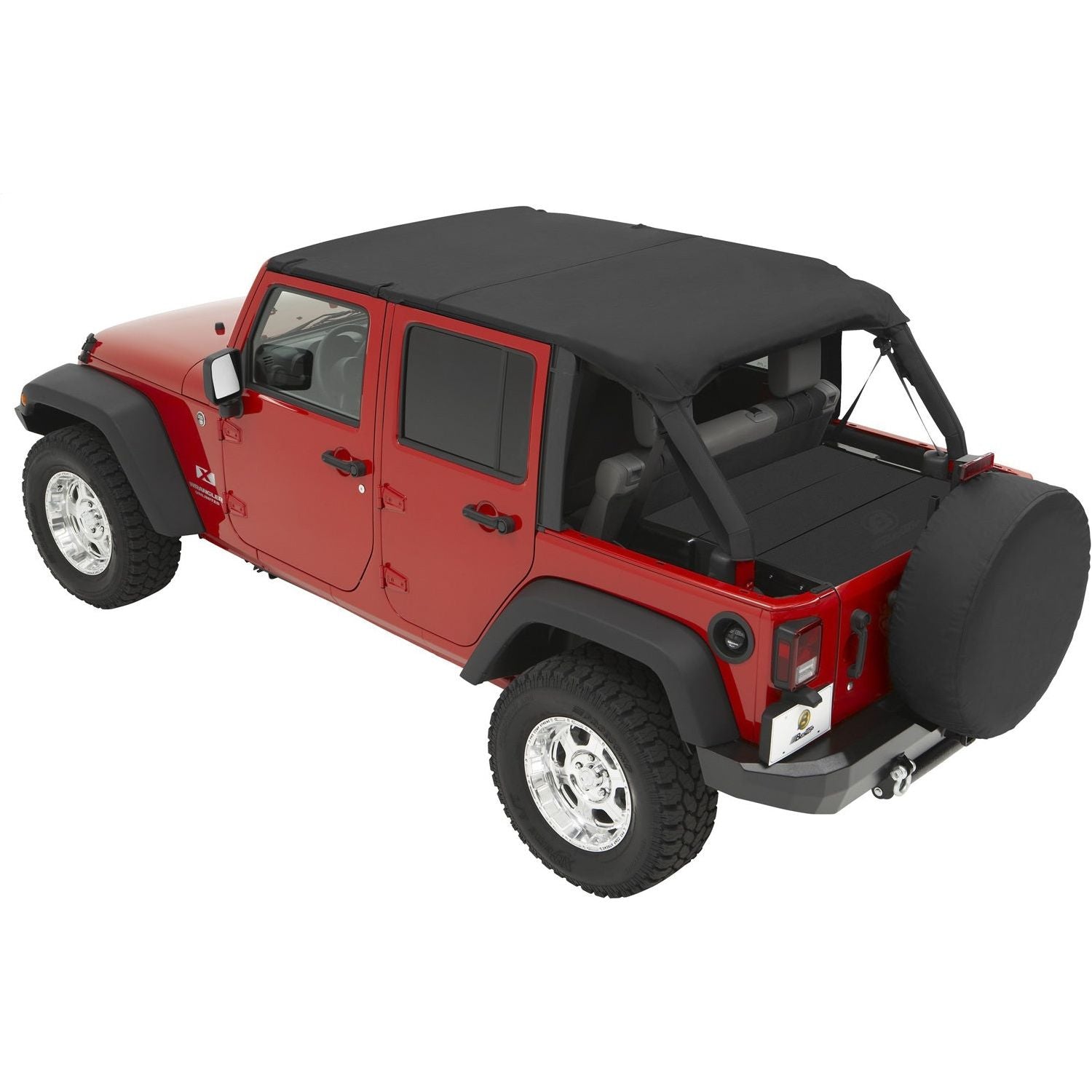 VEHICLE FITMENT: JK (4DR) 2007-2018 I Bestop Header Extended Safari Style Bikiniâ„¢ Top Black Diamond Color-Matched No Drill Header Requires Installation Of PN[51243] I A regular Bikini top is fine for the front seat occupants, but what about those folks in the back? A Safari Bikini Top keeps everybody covered while riding the trails without your soft top. Safari Bikini tops have extended length and install over both the front and rear seats for stylish protection while enjoying an open air drive.