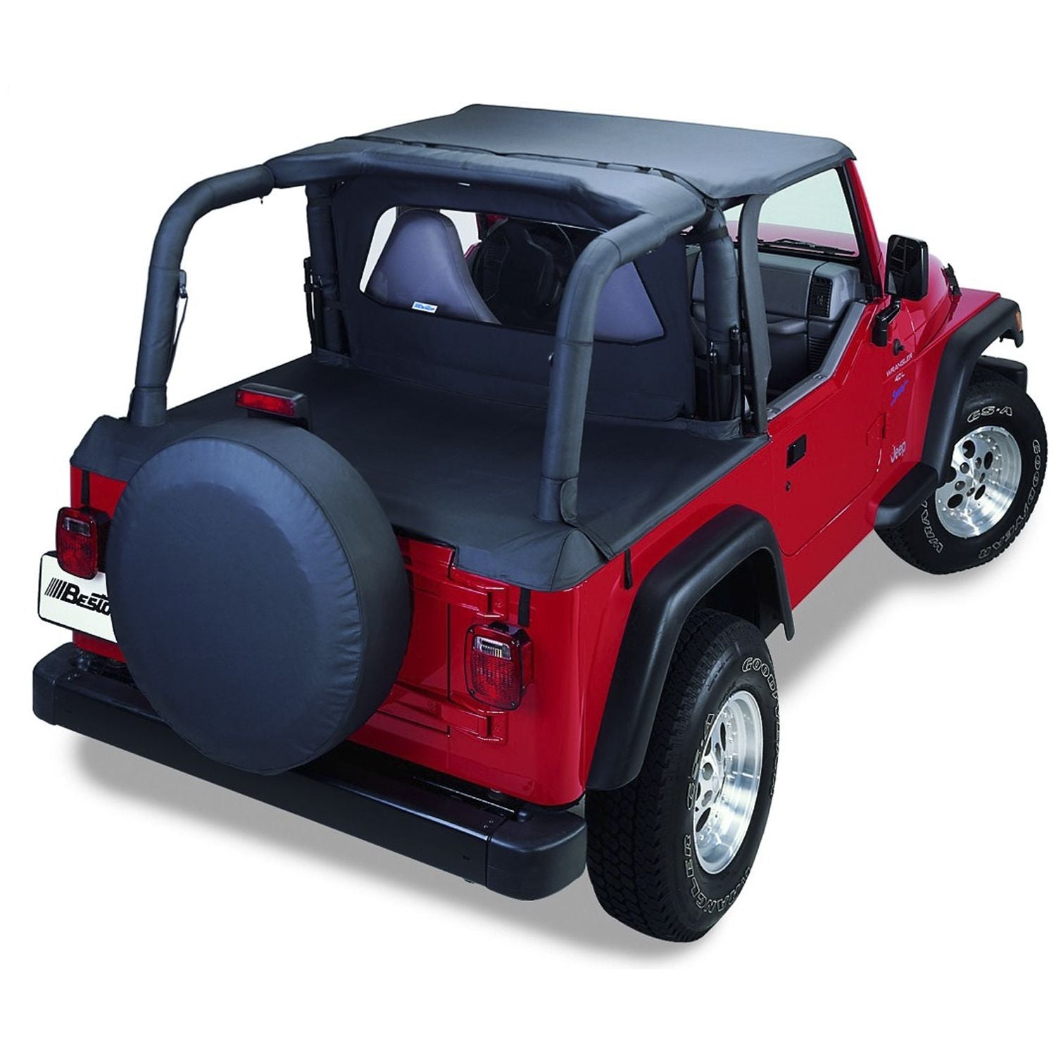 VEHICLE FITMENT: TJ WRANGLER (1996-2006) I Bestop Header Standard Targa Style BikiniTop Black Diamond Color-Matched No Drill Header Requires Installation Of PN[51238] I Bikini Tops are the perfect companion to top-off, doors-off open air rides on the trails or just around town. This Bikini top style provides shade over the front seats for you, a co-driver or Fido.
