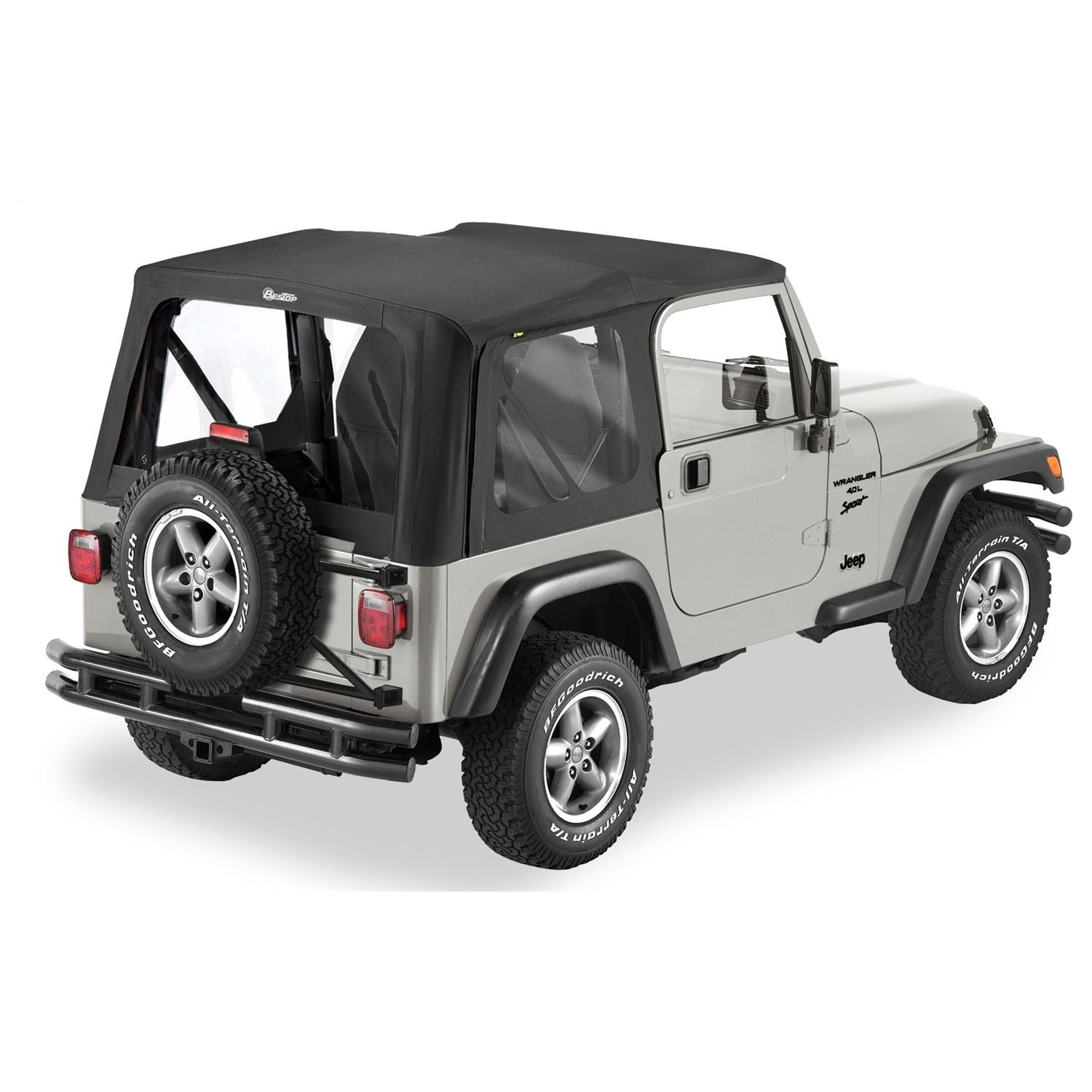 VEHICLE FITMENT: TJ WRANGLER (1996-2006) I Bestop Replace-A-Top Black Denim Clear Windows No Door Skins Included I Your original soft top can get damaged or begin to show its age after all those years battling the sun and weather. Replace-A-Top takes advantage of your still-good factory hardware, and gives you all new fabric and windows without having to replace your existing frames and hardware. It's the most economical way to make your top look new again.
