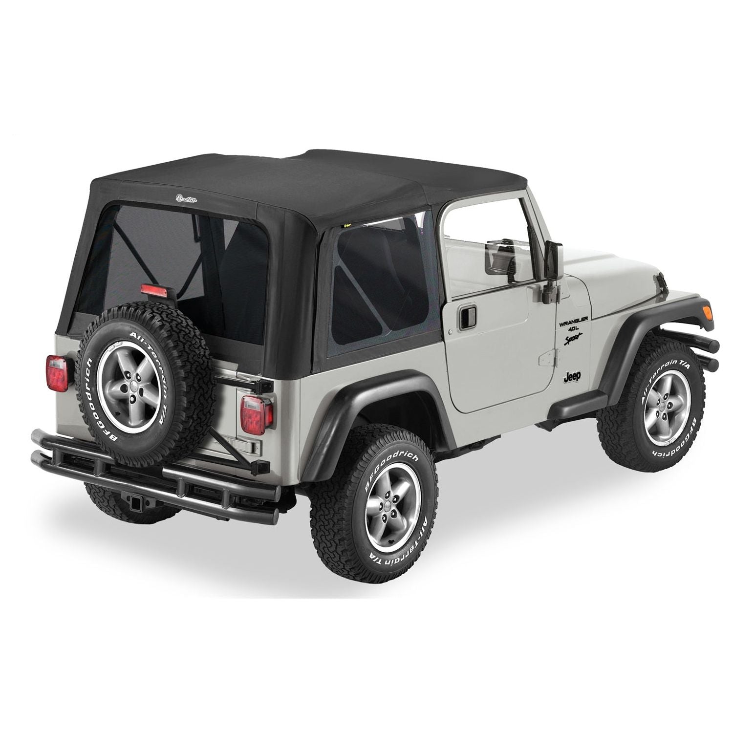 VEHICLE FITMENT: TJ WRANGLER (1996-2006) I Bestop Replace-A-Top Black Denim Tinted Windows No Door Skins Included I Your original soft top can get damaged or begin to show its age after all those years battling the sun and weather. Replace-A-Top takes advantage of your still-good factory hardware, and gives you all new fabric and windows without having to replace your existing frames and hardware. It's the most economical way to make your top look new again.