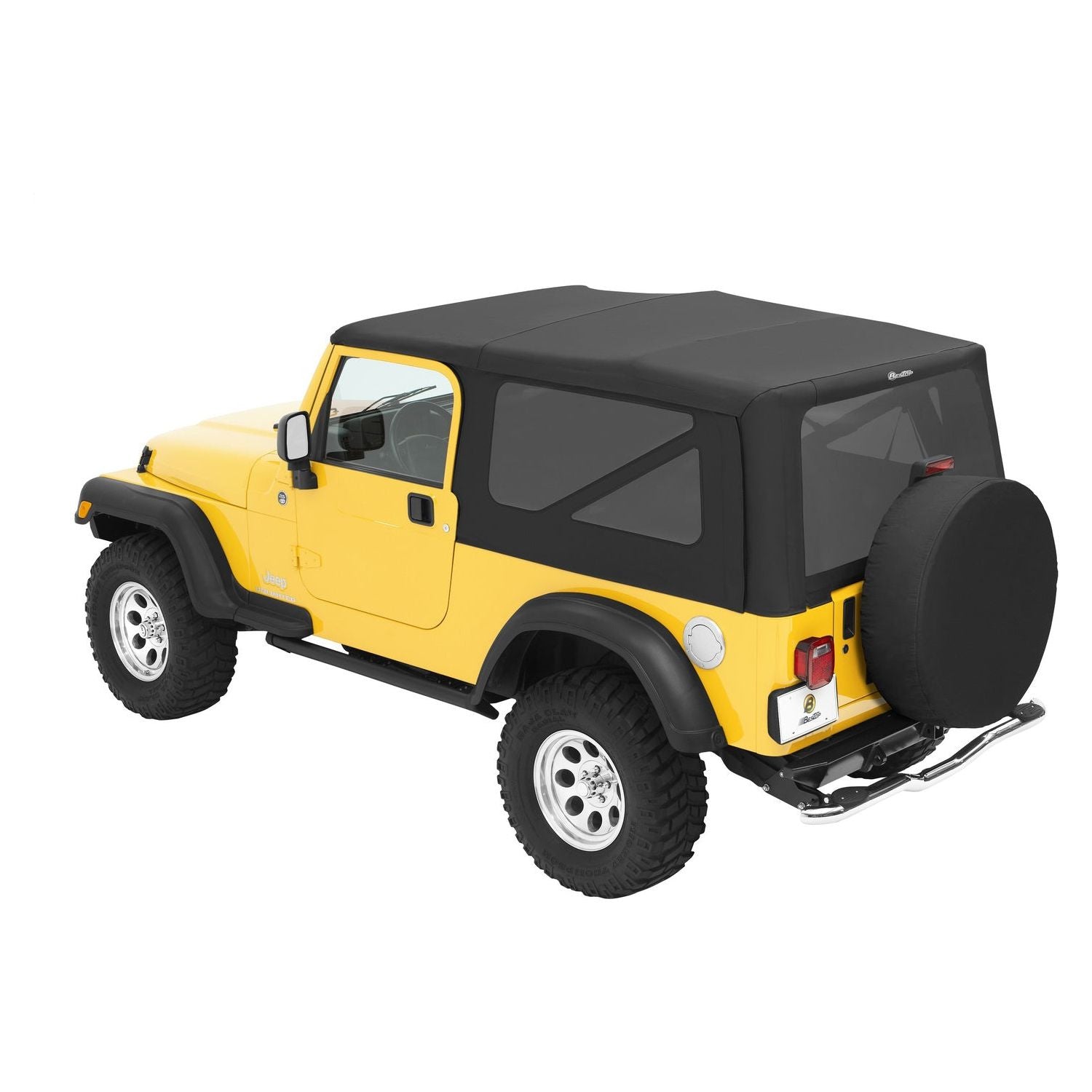 VEHICLE FITMENT: TJ WRANGLER (1996-2006) I Bestop Replace-A-Top Black Diamond Tinted Windows No Door Skins Included I Sailcloth Replace-A-Top takes the tried-and-true formula of our original Replace-A-Top and adds heavier sailcloth fabric. This premium multi-ply fabric helps reduce road sounds, absorb wind noise, and keep interior climate more consistent than dual-ply fabric. Require factory original hardware .
