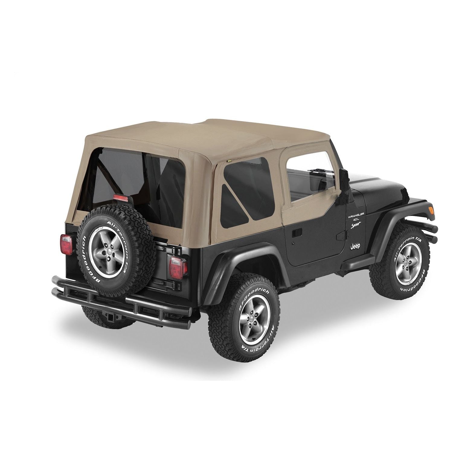 VEHICLE FITMENT: TJ WRANGLER (1996-2006) I Bestop Replace-A-Top Dark Tan Tinted Windows Door Skins Included I Your original soft top can get damaged or begin to show its age after all those years battling the sun and weather. Replace-A-Top takes advantage of your still-good factory hardware, and gives you all new fabric and windows without having to replace your existing frames and hardware. It's the most economical way to make your top look new again.