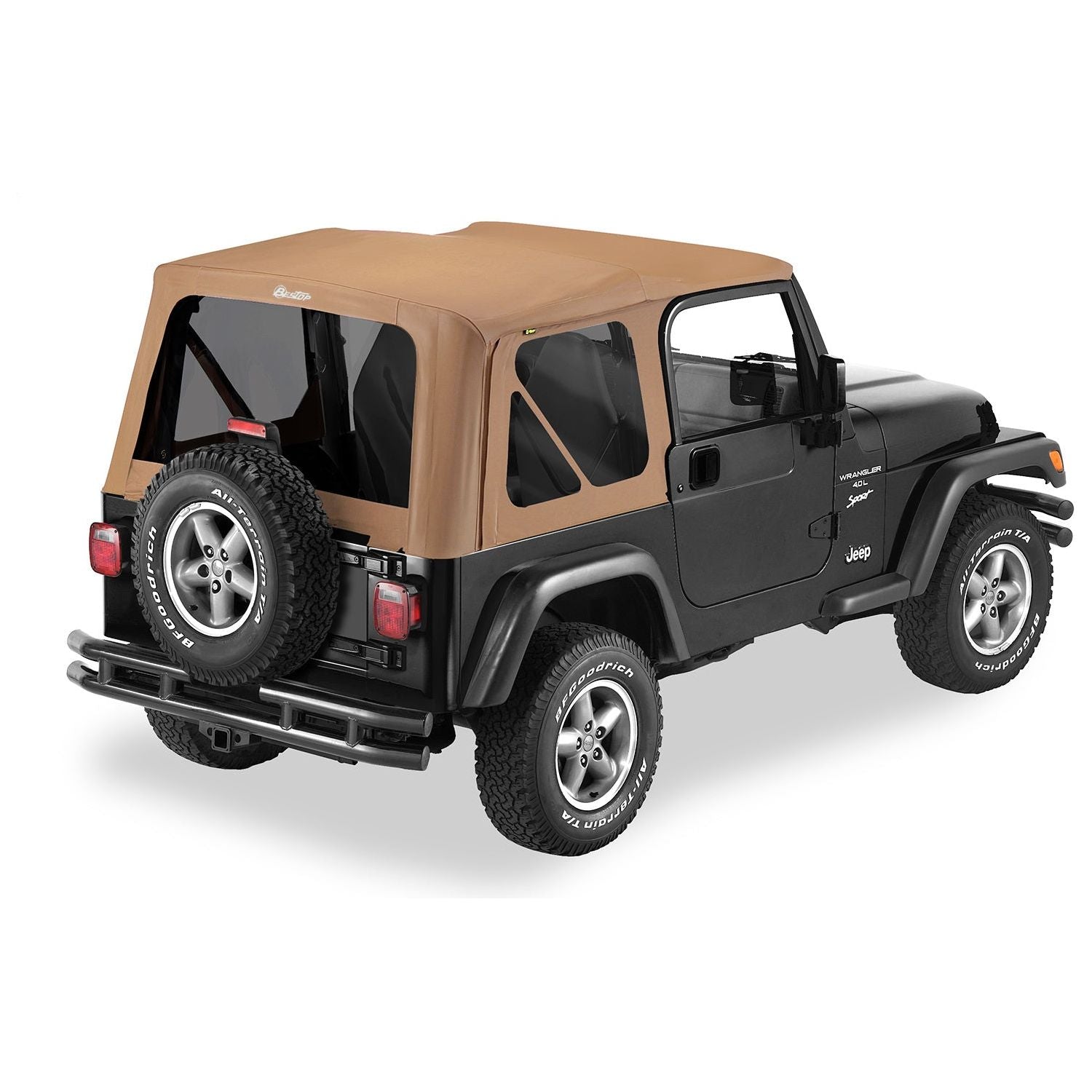 VEHICLE FITMENT: TJ WRANGLER (1996-2006) I Bestop Replace-A-Top Spice Tinted Windows No Door Skins Included Sailcloth I Sailcloth Replace-A-Top takes the tried-and-true formula of our original Replace-A-Top, and adds heavier sailcloth fabric. This premium multi-ply fabric helps reduce road sounds, absorb wind noise, and keep interior climate more consistent than dual-ply fabric.