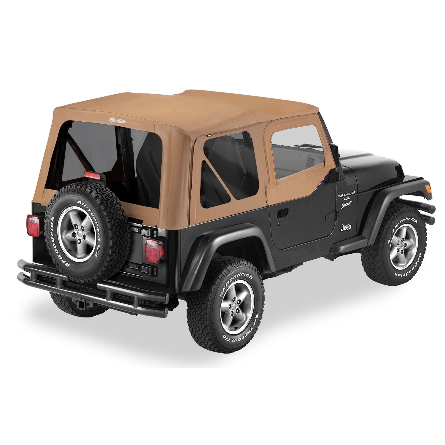 VEHICLE FITMENT: TJ WRANGLER (1996-2006) I Bestop Replace-A-Top Spice Tinted Windows Upper Door Skins Included I Sailcloth Replace-A-Top takes the tried-and-true formula of our original Replace-A-Top and adds heavier sailcloth fabric. This premium, multi-ply fabric helps reduce road sounds, absorb wind noise, and keep interior climate more consistent than dual-ply fabric. Requires factory original hardware .