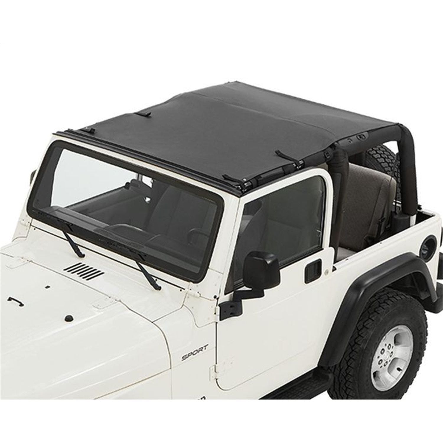 VEHICLE FITMENT: TJ WRANGLER (1996-2006) I Bestop Sun Extended Safari Style BikiniTop Black Diamond I Bikini Tops are great, but if you want to put your soft top back on, the Bikini Top has to come off as well as the windshield channel. Sun Bikini eliminates all that because it doesn't interfere with your regular soft or hard top and doesn't require a separate, extra-cost windshield channel. It's like an interior sun shade you never have to remove, top up or top down. It offers filtered sunlight or even complete shade with the least amount of effort. Sun Bikinis strap into factory windshield header loops and center sport bar with J-Hook attachment to the upper door bars. Installation or removal is fast and easy. And the money saved in not needing a separate windshield channel can be put toward other Bestop accessories.