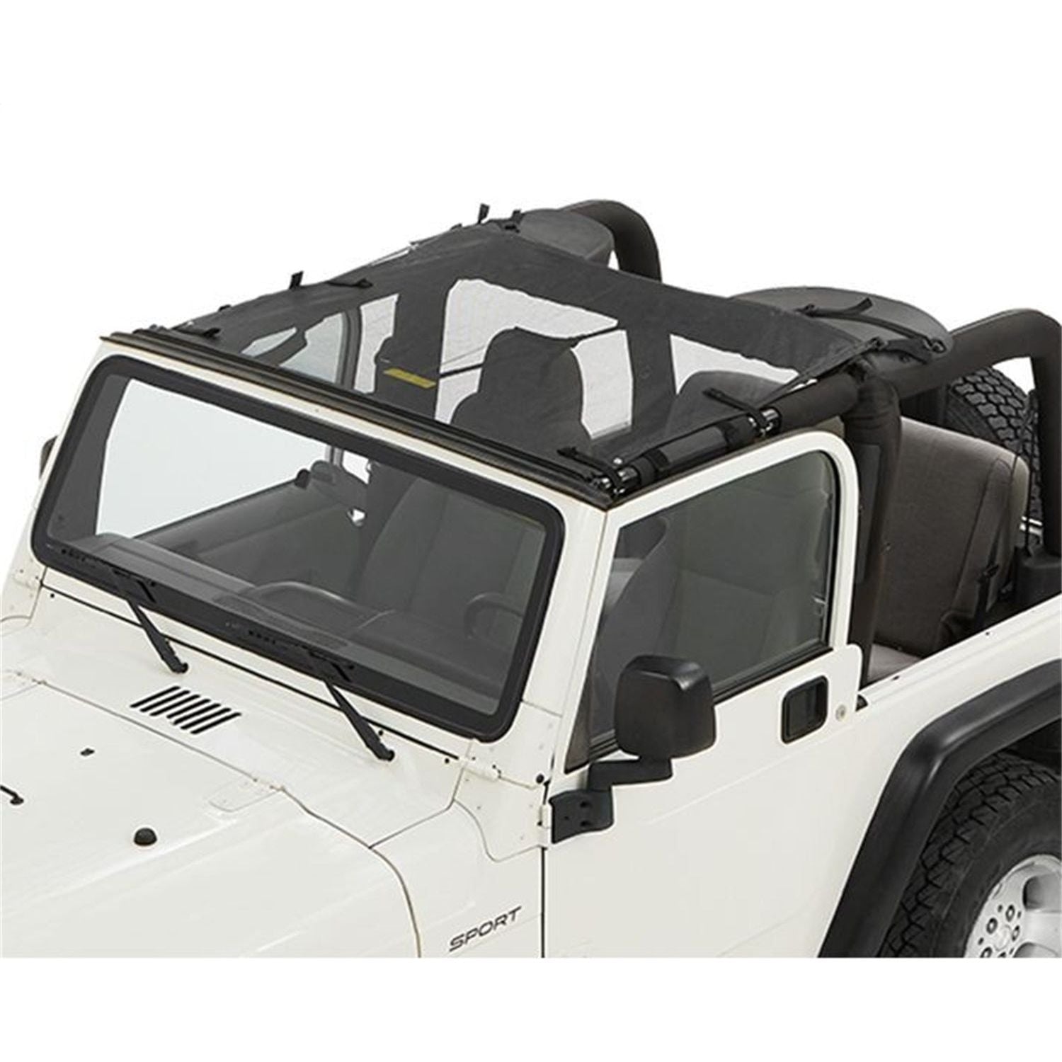 VEHICLE FITMENT: TJ WRANGLER (1996-2006) I Bestop Sun Standard Targa Style BikiniTop Mesh I Bikini Tops are great, but if you want to put your soft top back on, the Bikini Top has to come off as well as the windshield channel. Sun Bikini eliminates all that because it doesn't interfere with your regular soft or hard top and doesn't require a separate, extra-cost windshield channel. It's like an interior sun shade you never have to remove, top up or top down. It offers filtered sunlight or even complete shade with the least amount of effort. Sun Bikinis strap into factory windshield header loops and center sport bar with J-Hook attachment to the upper door bars. Installation or removal is fast and easy. And the money saved in not needing a separate windshield channel can be put toward other Bestop accessories.