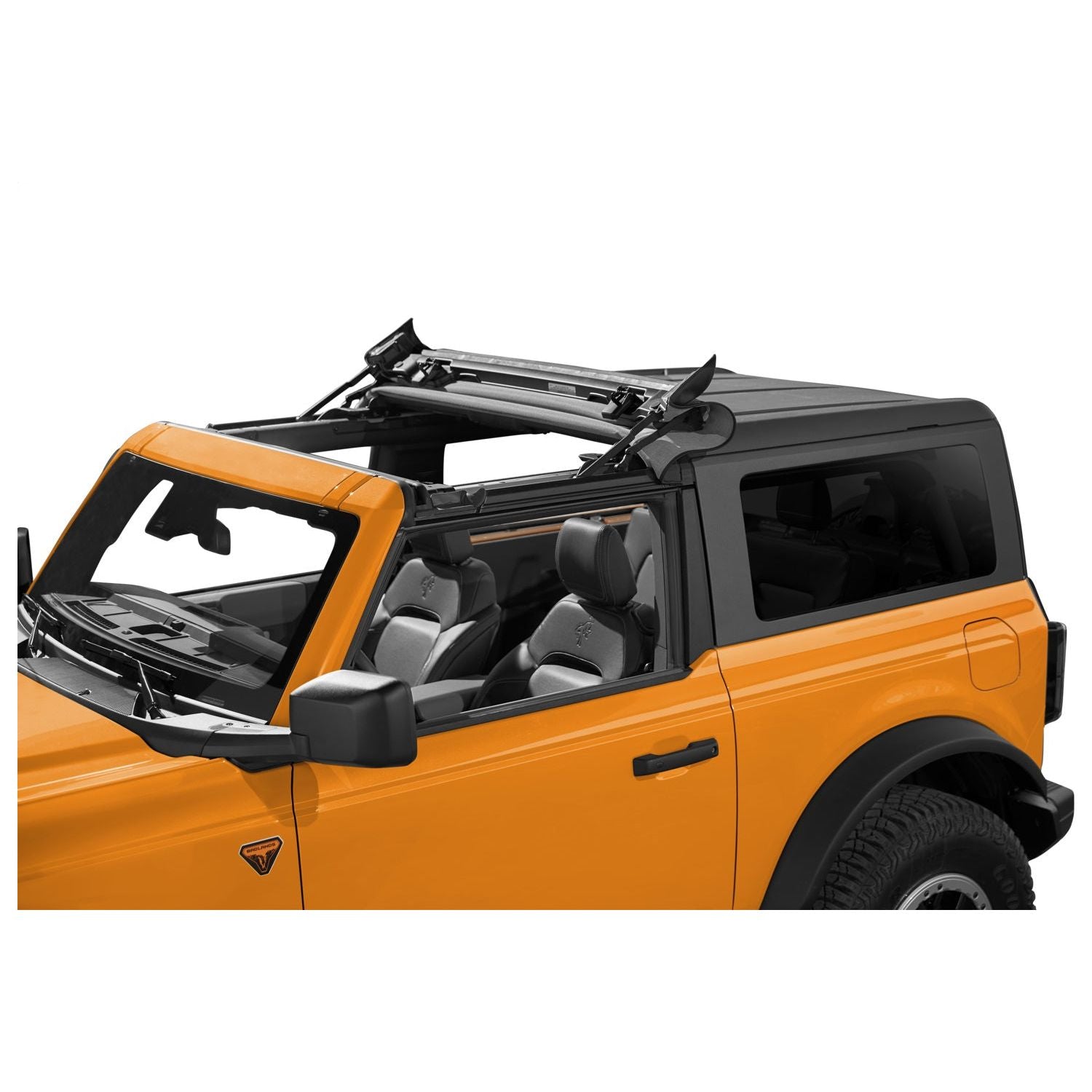 VEHICLE FITMENT: FORD BRONCO (2021-2024) I Bestop Sunrider For Hardtop Black Diamond I The Sunrider For Hardtop by Bestop - all-purpose, all-weather, year-round replacement for the overhead hard top panels. By adding a Sunrider for Hardtop to your new Bronco, you'll discover a whole new level of open-air adventure. Simply replace your overhead hardtop panels with this soft top and enjoy the sun, moon and stars – and never worry about being caught out in the rain unprepared. The Sunrider for Hardtop easily and quickly flips back in a matter of seconds. Open up to the world around you.