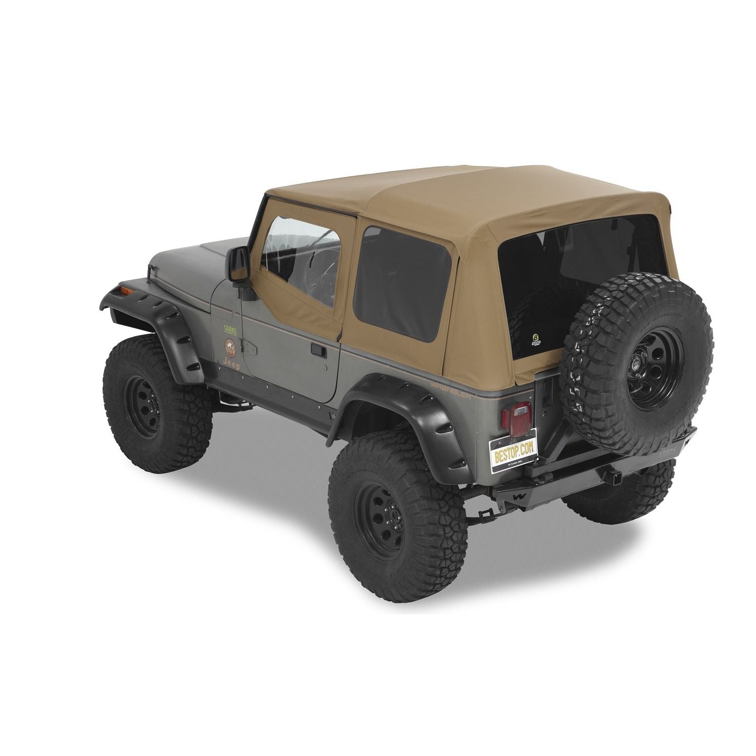 VEHICLE FITMENT: YJ 1987-1995 I Bestop Supertop Squareback Soft Top Spice No Doors Included Tinted Side/Rear Windows I This special edition of Supertop NX for 1988-1995 Wranglers is meant to duplicate the look and function of the original factory soft top but with upgrades like tinted windows, heavier fabric, and corrosion-resistant hardware. If you are looking to do a restoration on a YJ or just want a great replacement soft top that folds back like the factory top, Supertop NX is a sure bet. Don't forget to add Bestop Upper Half Door options (sold separately) to complete your installation.