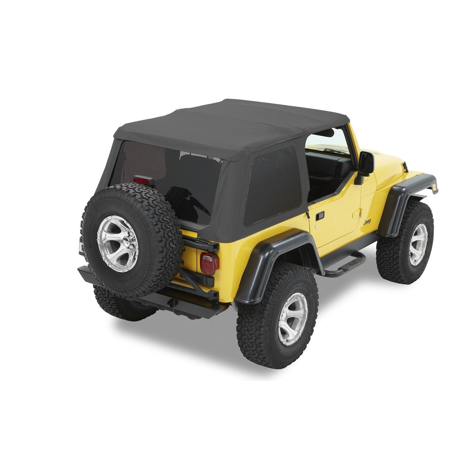 VEHICLE FITMENT: TJ WRANGLER (1996-2006) I Bestop Trektop Slantback Soft Top Black Denim Incl. Tinted Side/Rear Windows No Doors Included I It's all about that angle in the back, isn't it? That fastback styling is what makes Trektop the best-selling soft top in the market today. But it's more than style. No more top bows or frames needed as the Wrangler sport bars give it shape and support. Remove the windows and it becomes a Safari Bikini top. It's actually two tops in one.