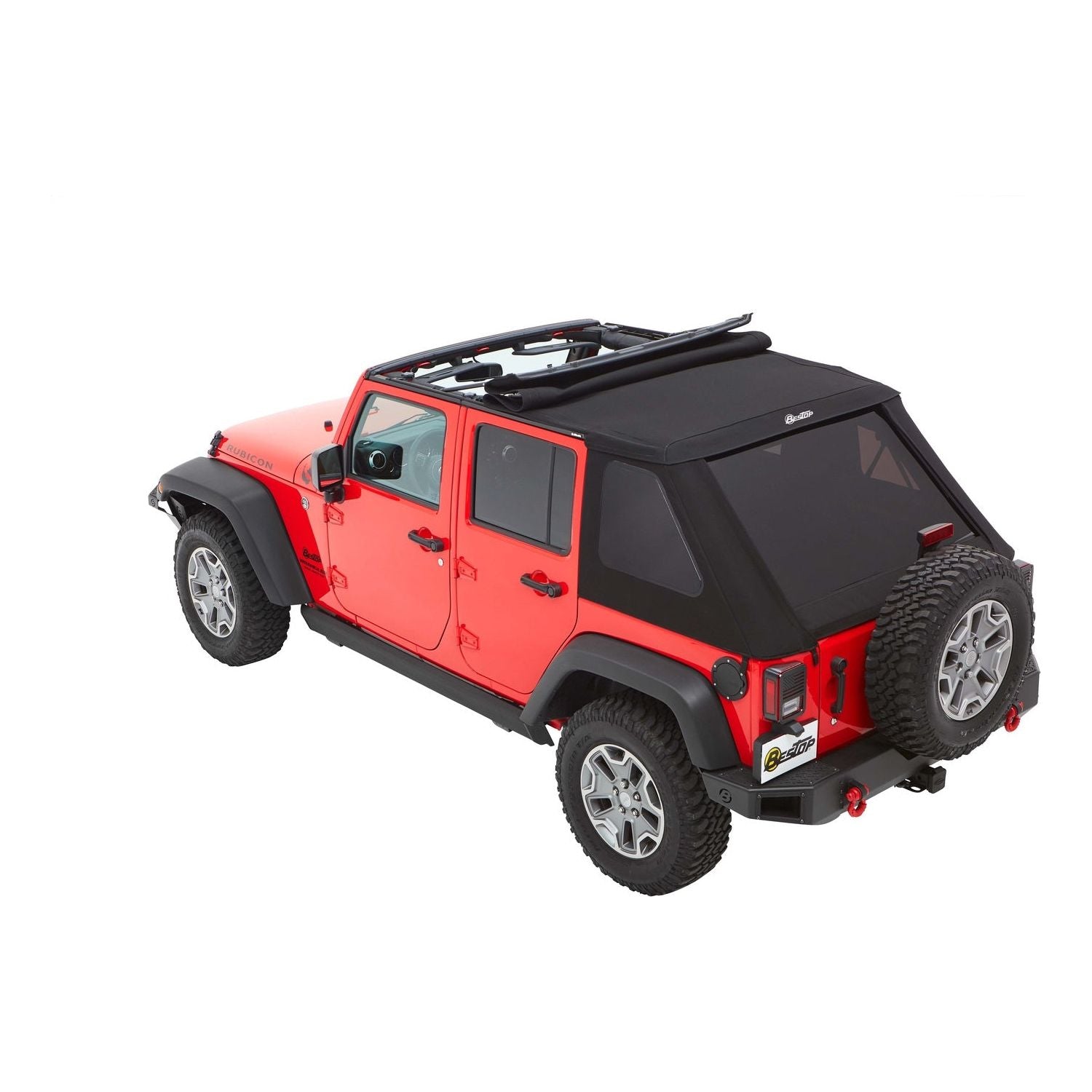 VEHICLE FITMENT: JK (4DR) 2007-2018 I Bestop Trektop Slantback Soft Top Black Twill I The Trektop brings a tight, clean fabric soft top look to your Jeep. Run it as a fully-enclosed, all-season soft top for protection from the elements or remove the sides and rear window and enjoy it as a bikini allowing you to feel the breeze as you experience your outdoor adventure. Zippered pockets above the driver and passenger provide for organization of small gear items. Zipper-less technology allows for an improved fit and easier installation. Use of the tailgate bar and clips allows for hassle-free opening of the tailgate.