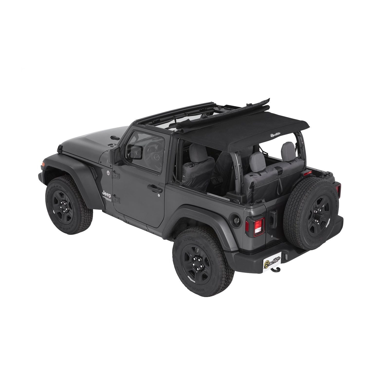 VEHICLE FITMENT: JL (2DR) 2018- PRESENT I Bestop Trektop Slantback Soft Top Black Twill I The first premium full soft top for the Jeep Wrangler JL Aftermarket is now available! The Trektop can be run fully enclosed as an all-season soft top or remove the sides and rear window and enjoy as a bikini. Plus, with the enhanced Sunrider design, the Trektop Sunrider can be easily opened from inside your Jeep.