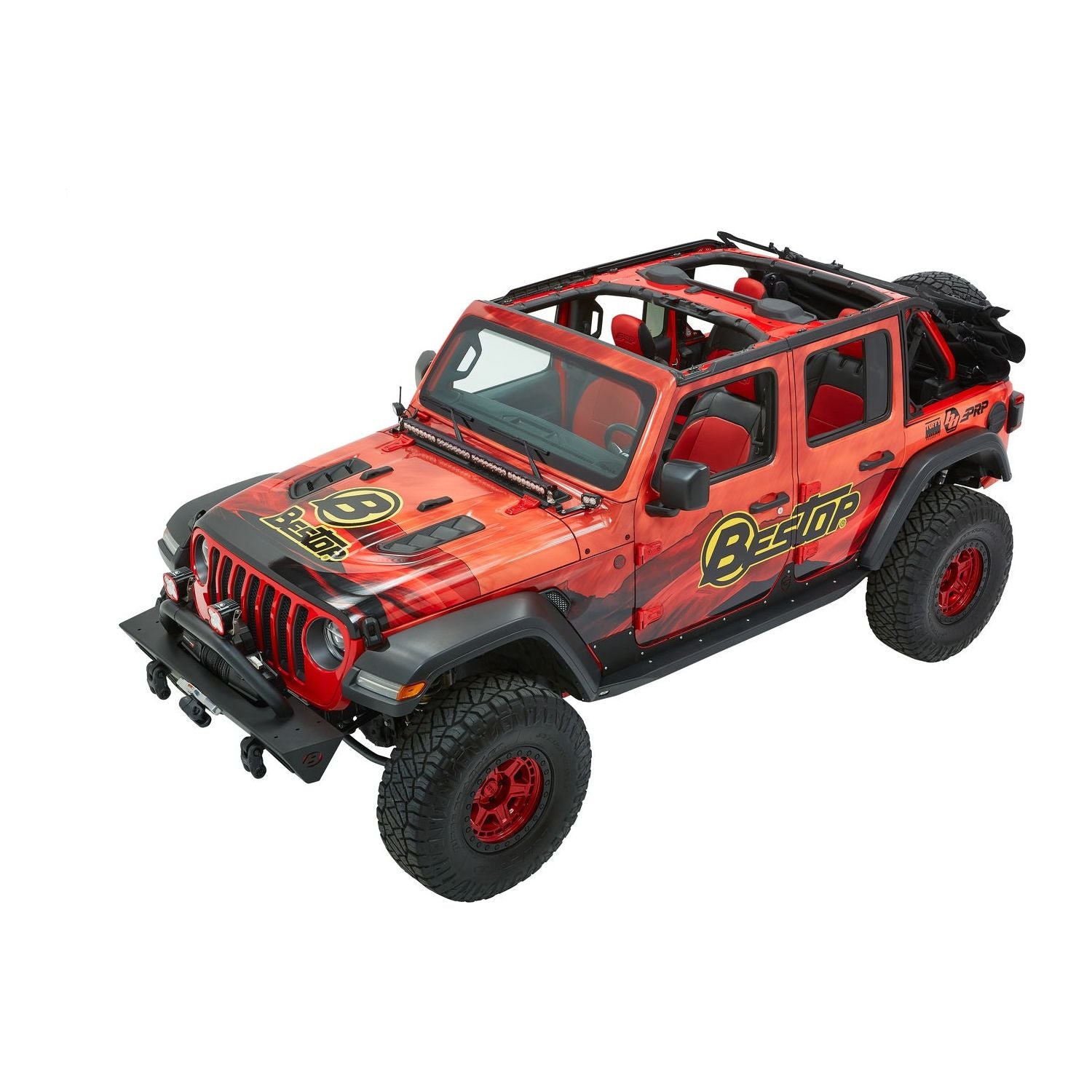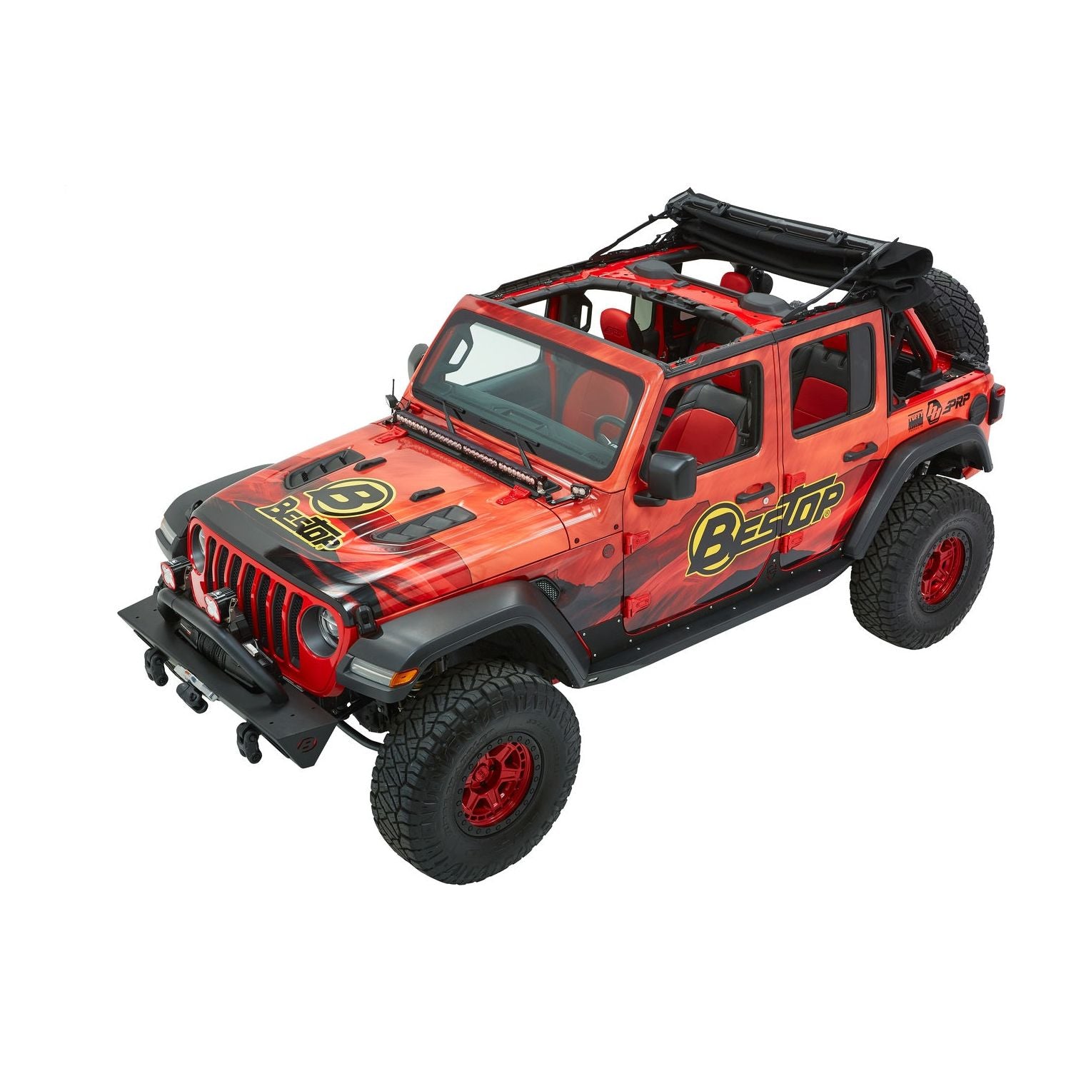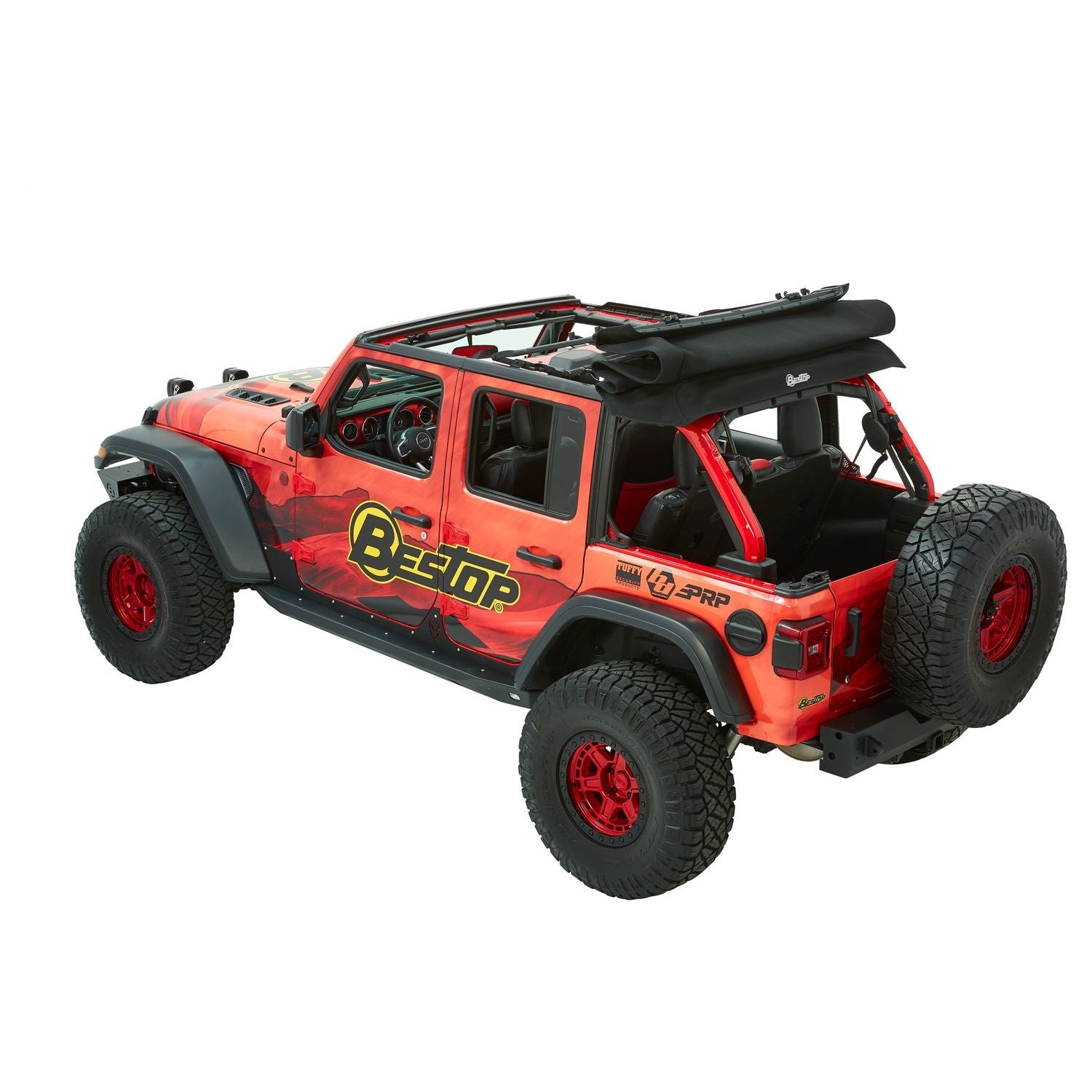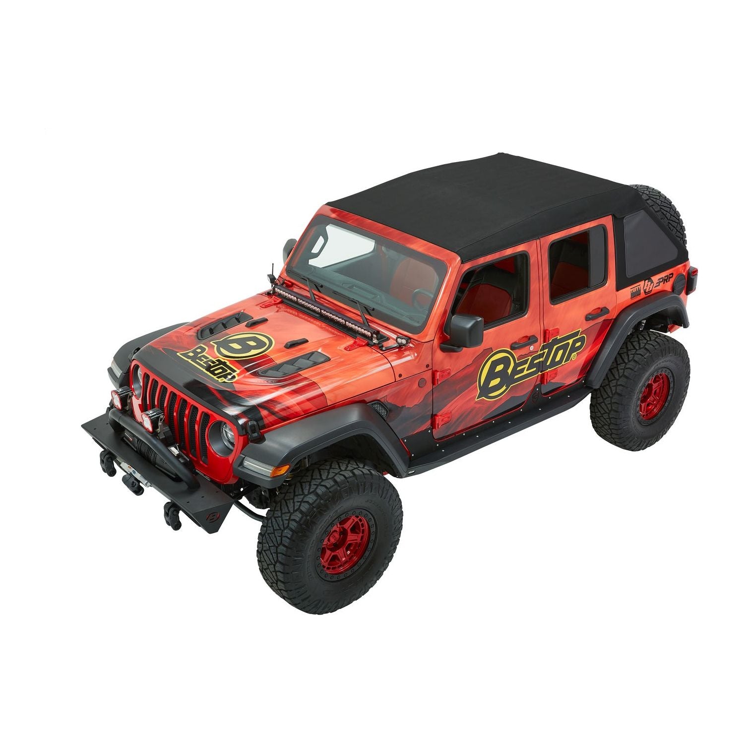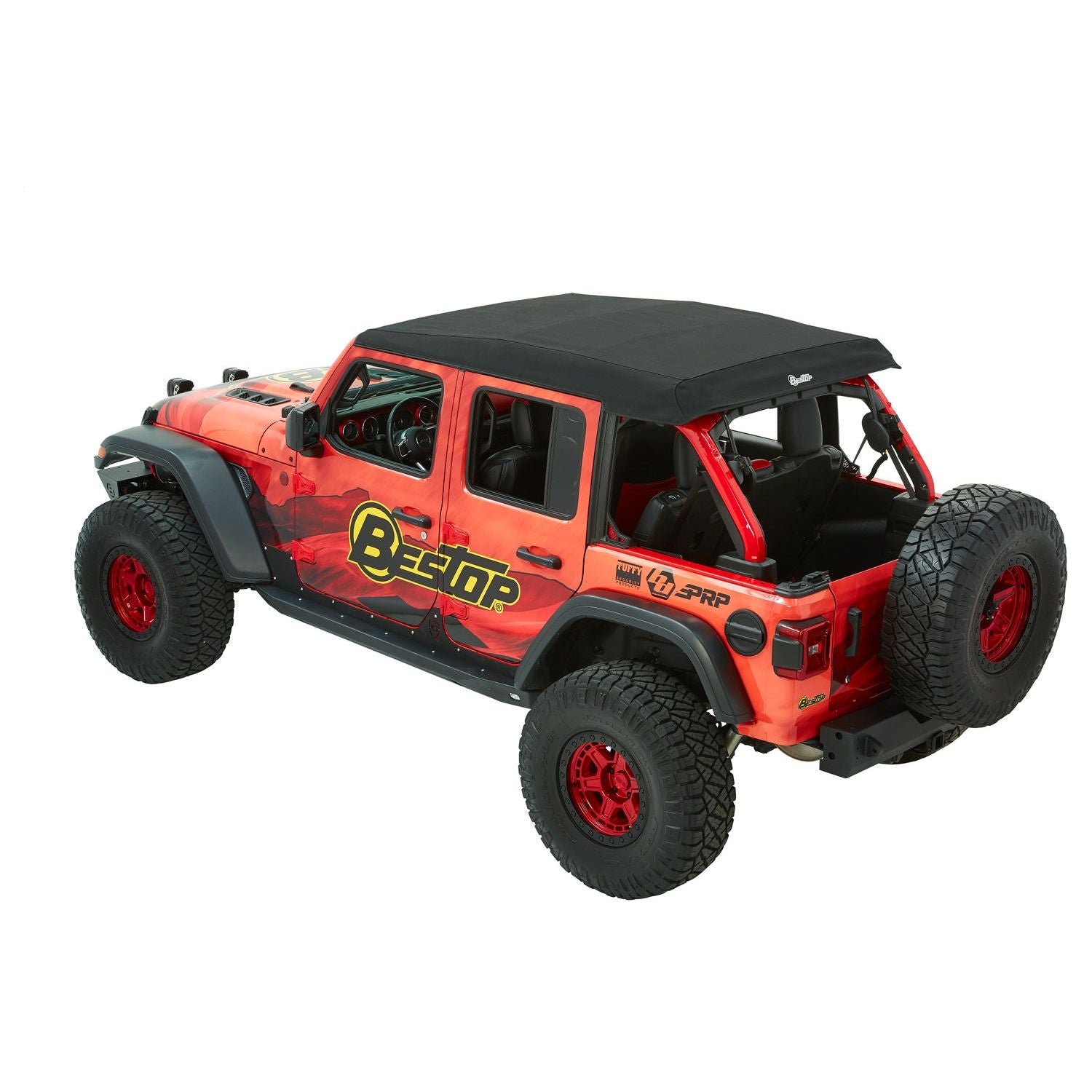 VEHICLE FITMENT: JL (4DR) 2018-PRESENT I Bestop Trektop Ultraâ„¢ Slantback Soft Top Black Twill I The Trektop Ultra takes our most advanced soft top for the Jeep Wrangler JL (Supertop Ultra) and adds the coveted fastback styling! The Trektop Ultra can fully retract with our patent-pending guide track system. The enhanced Sunrider sunroof bathes all passengers in open air. Patented lift assist makes it simple for one person to shift the top from fully retracted to Sunrider position.