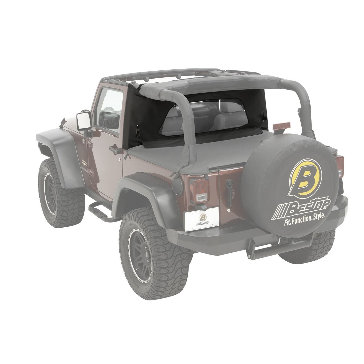 VEHICLE FITMENT: JK (2DR) 2007-2018 I Bestop Windjammer Wraparound Wind Screen Black Diamond Requires Soundbar Cap [80040-35] And Factory Door Surrounds I Wrap-Around Windjammer forms a complete seal around the sport bars and center section so nearly all penetration of wind, dust or debris from the rear is prevented. Add an optional Duster and you're covered.