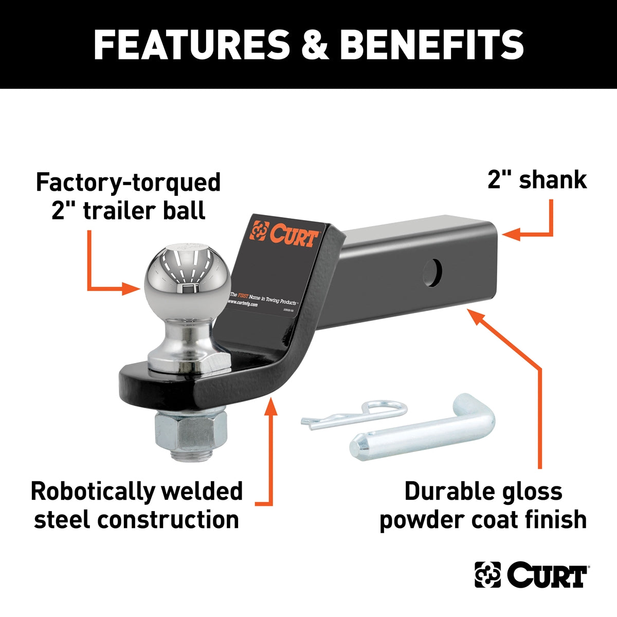 Factory Torqued CURT Trailer Ball Accepts A 2 Inch Coupler 2 Inch Drop For Precise Trailer Leveling Hollow Shank Weighs Less And Can Be Used With An Anti Rattle Kit Protected By A Durable Powder Coat Finish Trailer Ball Features A Polished Chrome Plated Finish 5/8 Inch Hitch Pin And Clip For Secure Mounting In Receiver Tube CNC Formed, Robotically Welded And Mechanically Descaled For A Perfect Fit Fits Trailer Hitches With A 2 Inch X 2 Inch Receiver Tube Opening Limited Lifetime Warranty: 1 Year Finish And Parts Warranty