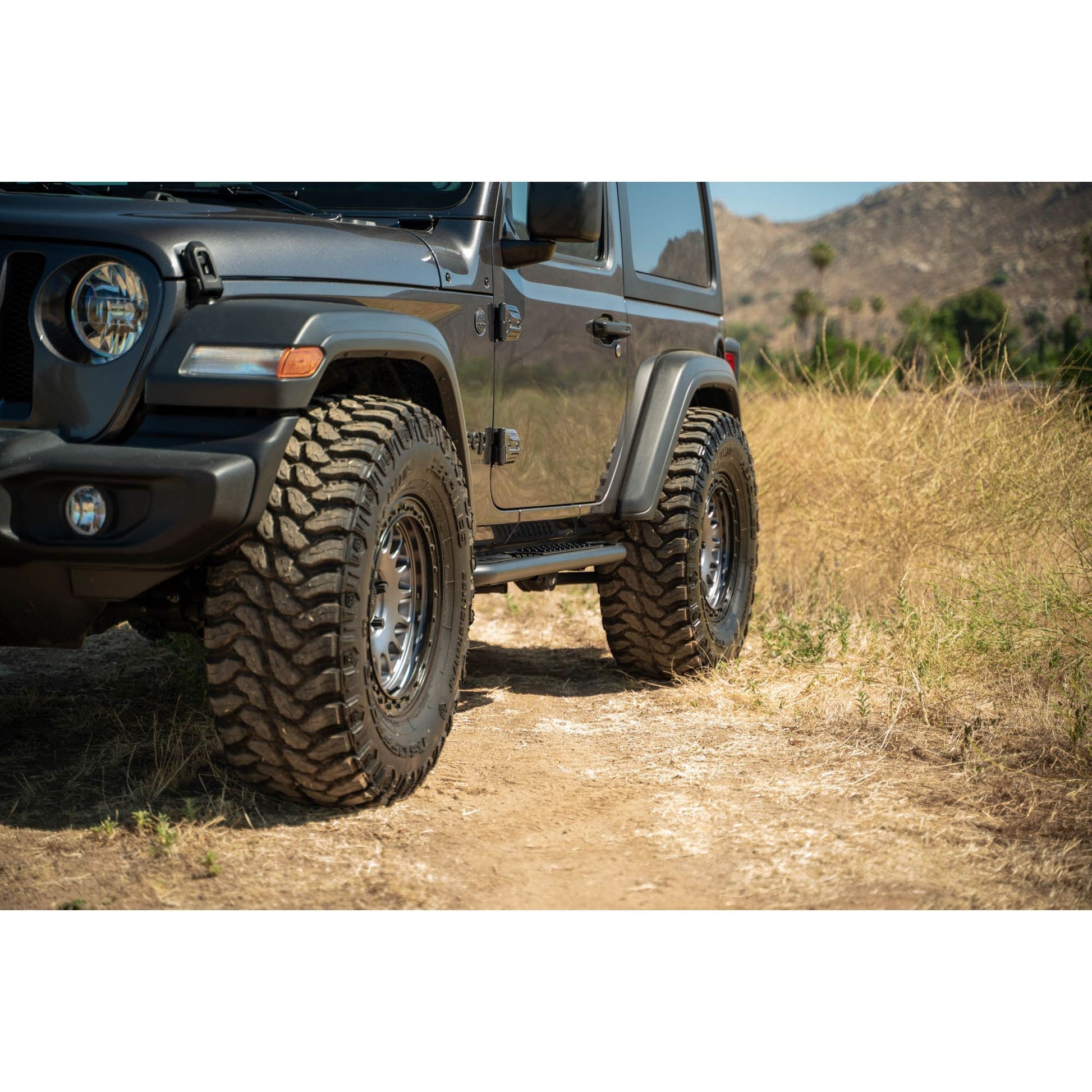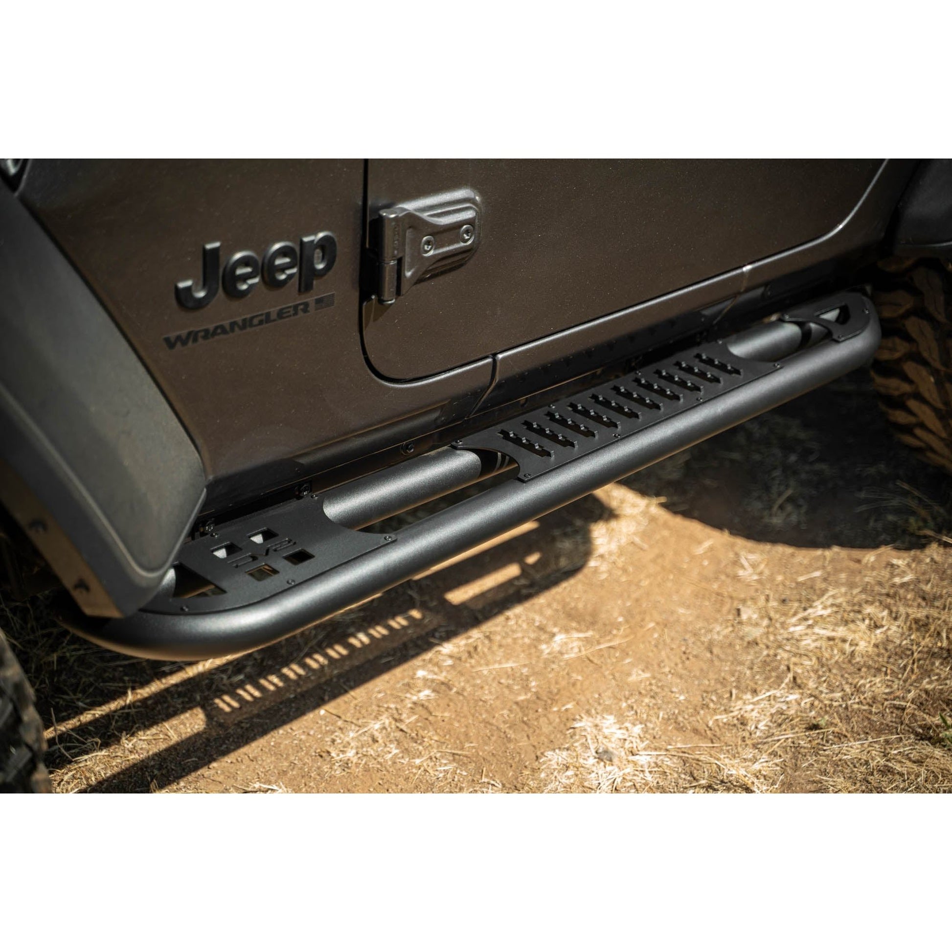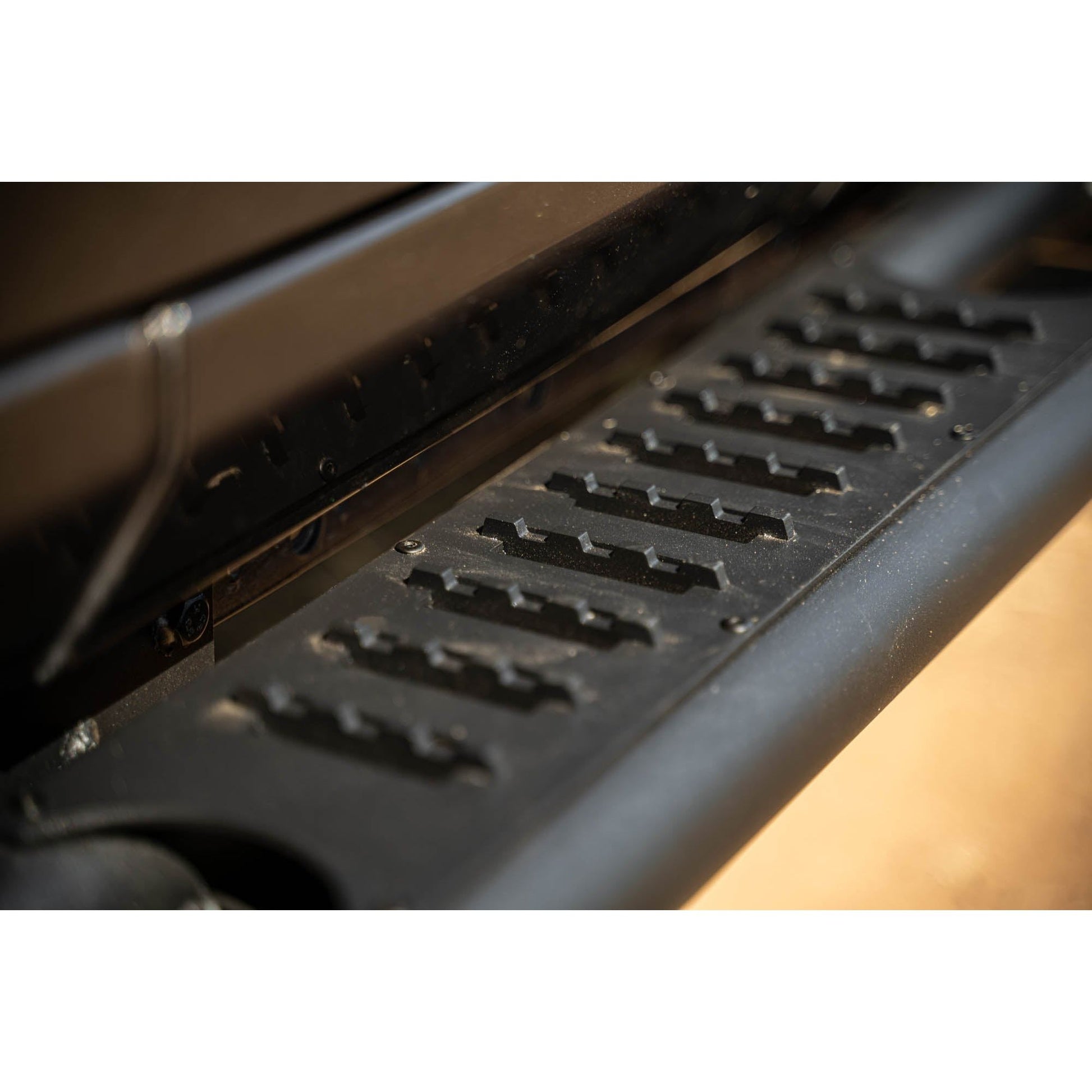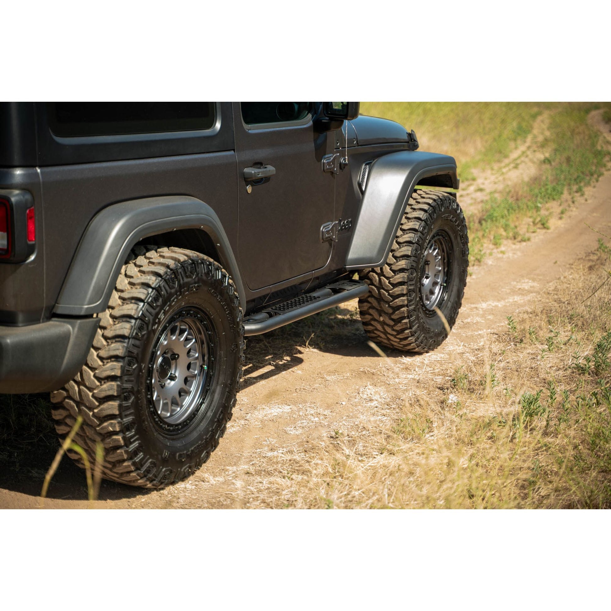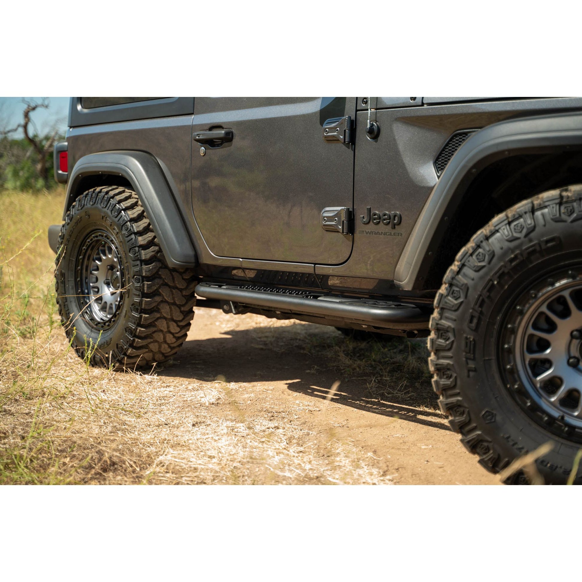 Our OE Plus Series Wrangler JL Side Steps offer the perfect solution for safely stepping in and out of your lifted Jeep. The steps feature a unique gripping design on the top plates to help prevent your feet from slipping in wet or dusty conditions. They mount to multiple points along the body pinch weld for strength and stability. The durable steel construction provides sturdiness while protecting your Jeep’s sides from light trail debris that are kicked up from the tires. The micro-texture black powder coat provides an aggressive off-road style and finish. Installation is a simple bolt-on process.