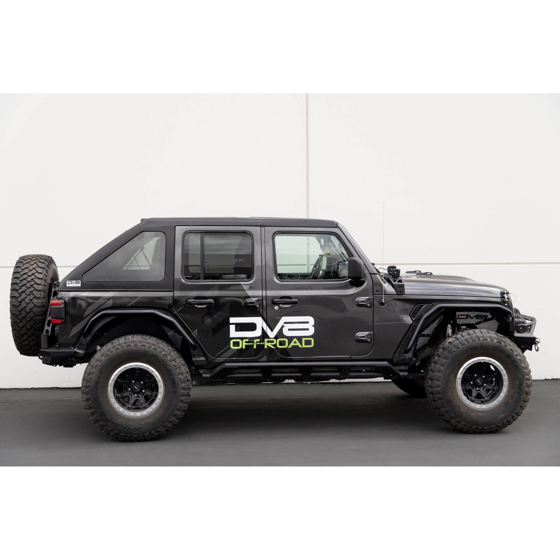 This DV8 top is a 2-piece design, so the section above the driver and passenger lifts off like a Targa top. All tops have carpeted interior and tinted windows. This top is fitted for the 4-Door Jeep Wrangler JL Unlimited.