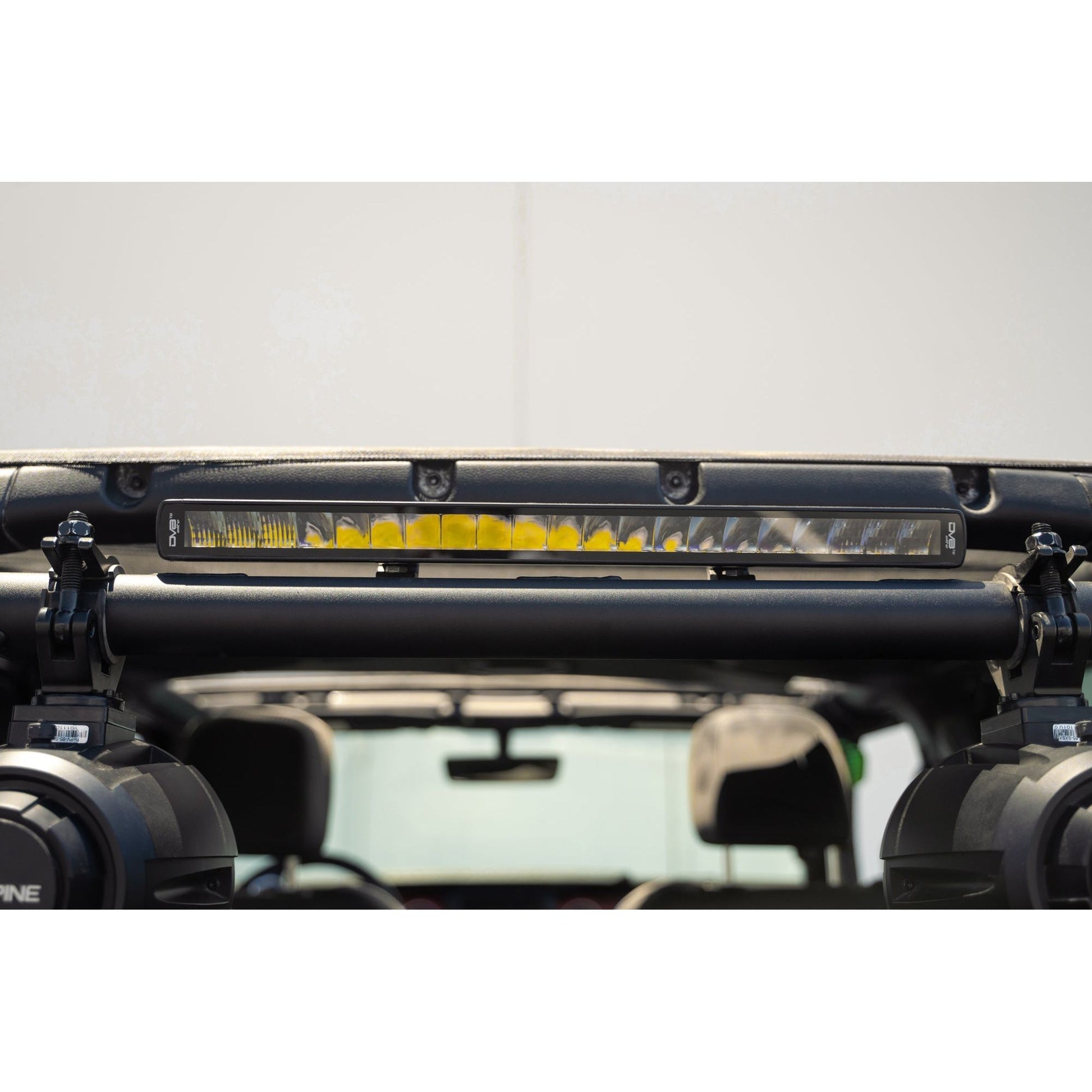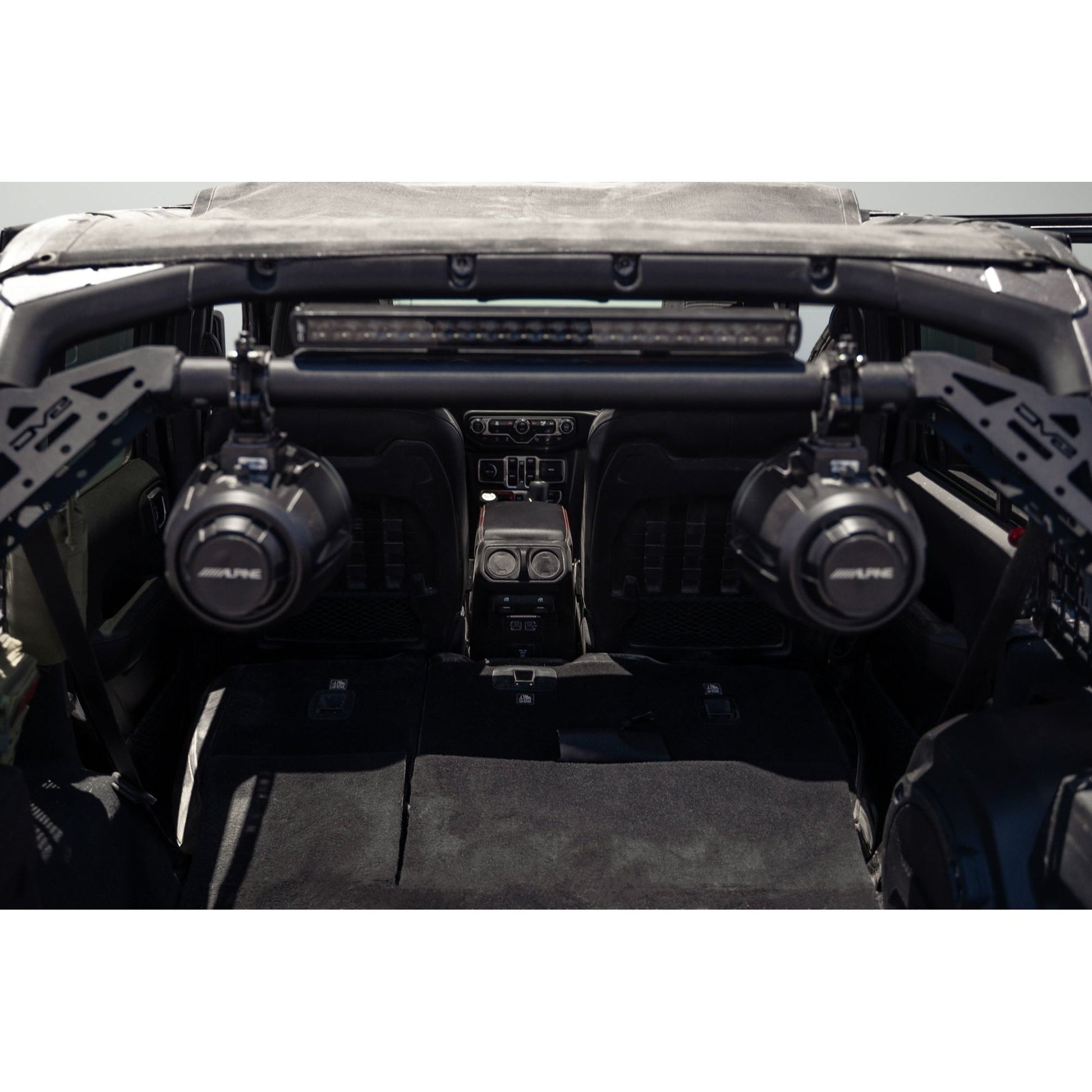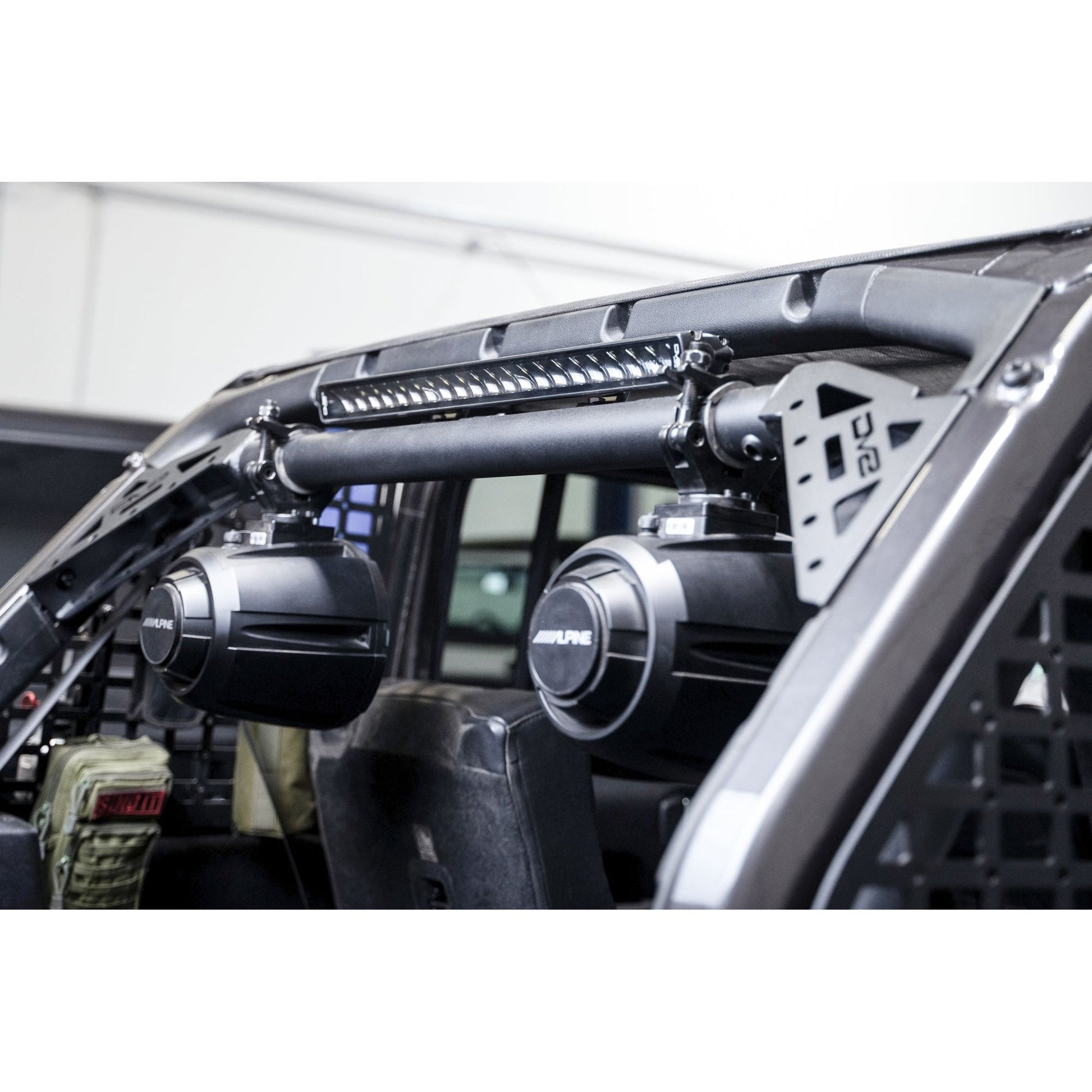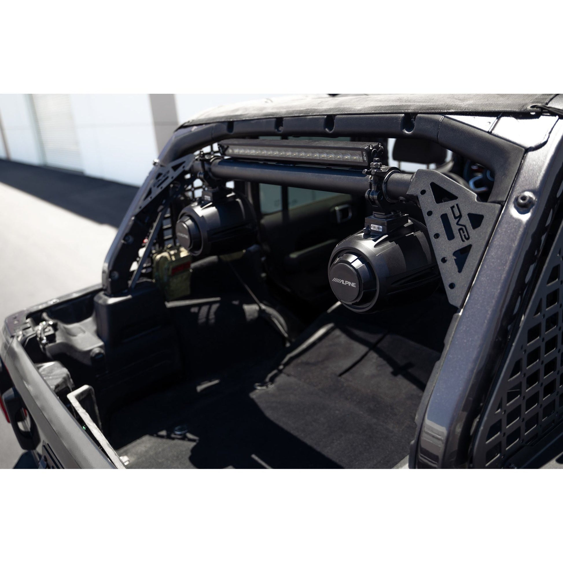 Elevate your Jeep Wrangler's audio and lighting capabilities with our Jeep Wrangler Rear Speaker & Light Bar Mount. Crafted with a sturdy 2-inch diameter tube, this mount offers a secure and precise fit for mounting speaker cans using roll bar clamps. Designed for versatility, our mount also features a dedicated mounting point for a rear-facing single row light bar, capable of accommodating up to 20 inches in length. Illuminate the path behind you with powerful rear-facing lighting, ensuring safety and visibility during your off-road adventures. We've gone the extra mile to ensure clean wire management, providing you with provisions for a clutter-free and professional-looking installation.