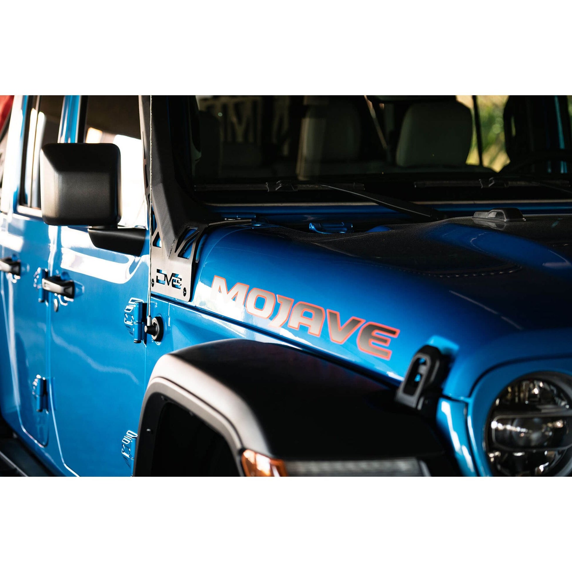 The DV8 392/Mojave Edition A-Pillar Light Bar Mount is designed to accommodate an over-windshield LED light bar, with mounting points that are 52-inches apart end to end. The brackets were designed to conceal the wire harness running from the light bar into the engine bay, keeping a clean appearance. Constructed from 4mm high strength steel and finished with a micro-texture black powder coat, these brackets look great and are protected against rust.