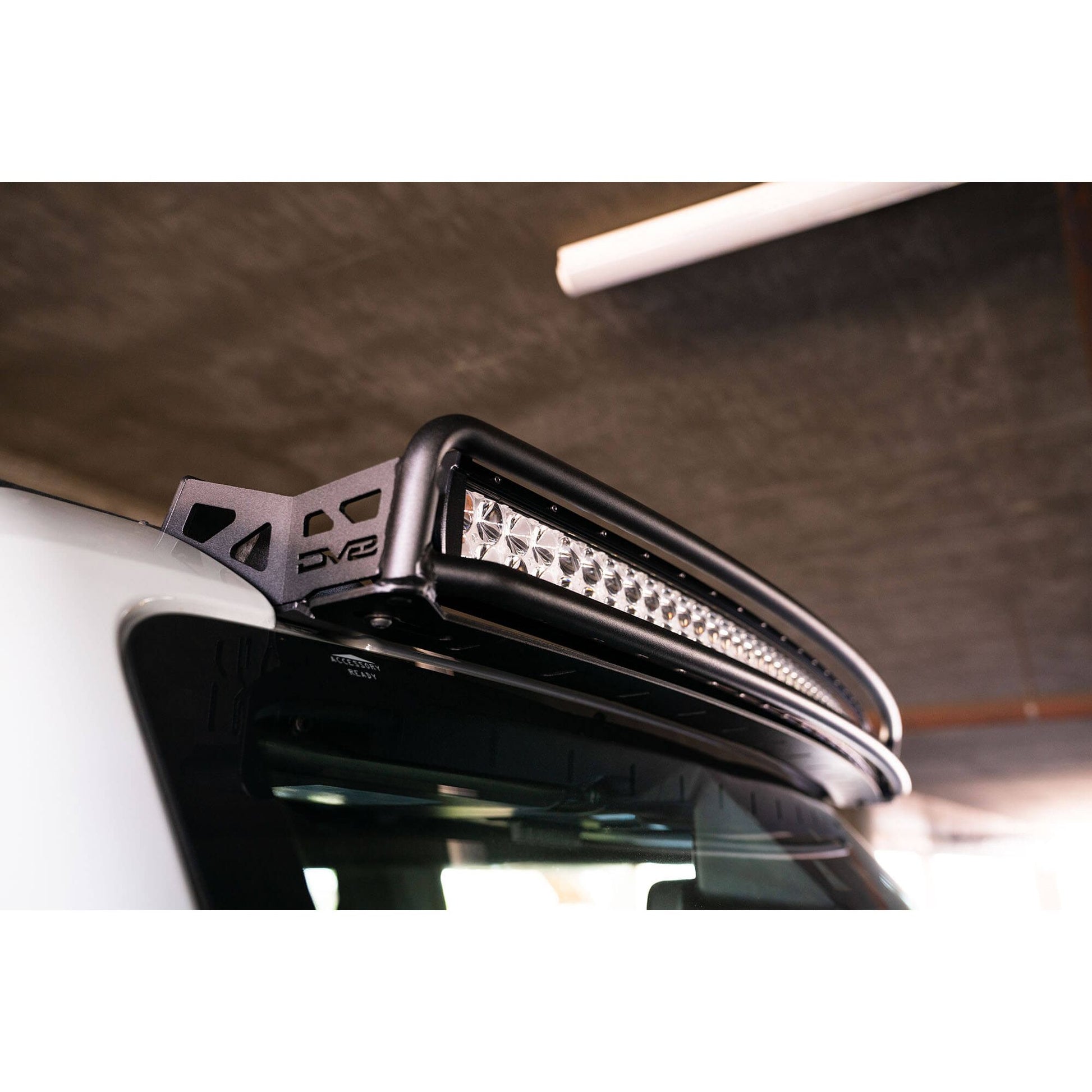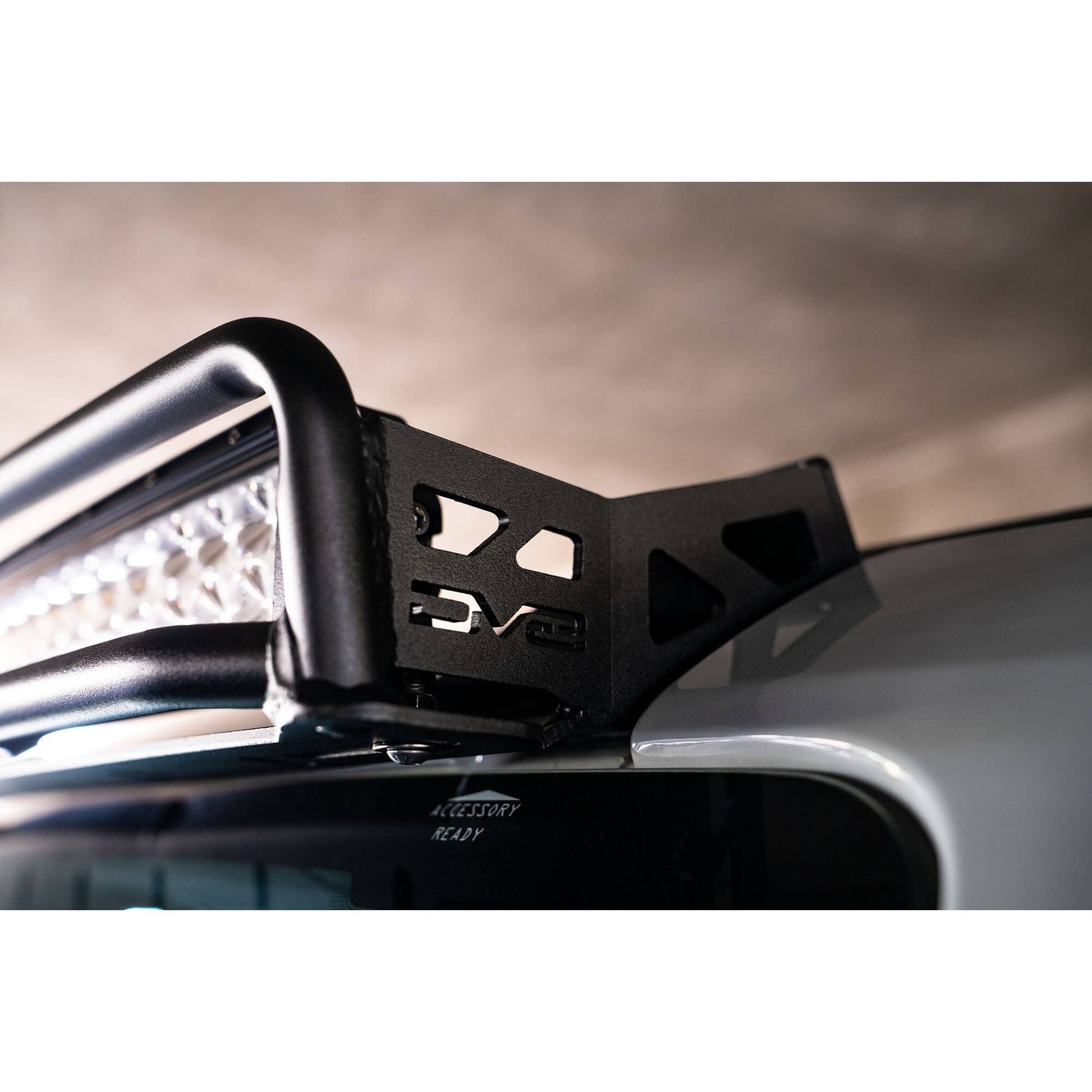 The bracket is constructed with a combination of 3/4" diameter tube steel and 4mm thick plate steel and finished in our micro-texture black powder coat. No modifications are required for install, as this mounts directly to the OEM accessory mounts located above the windshield.