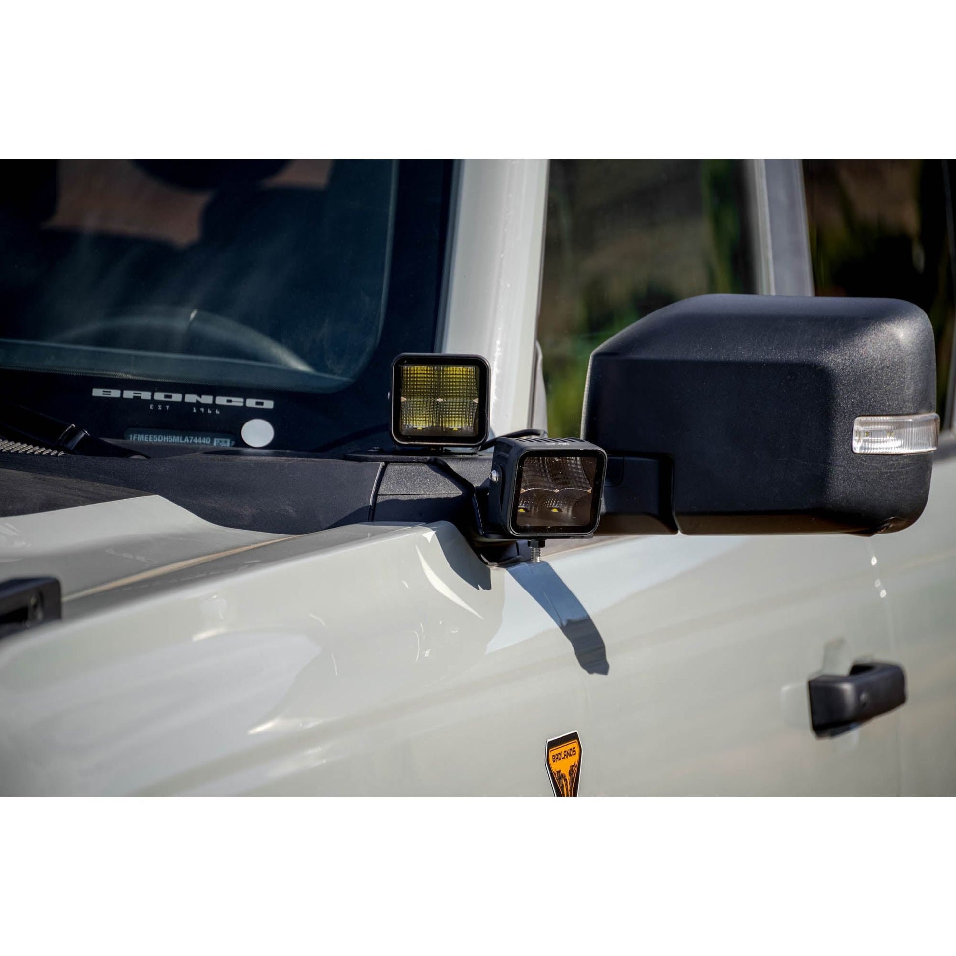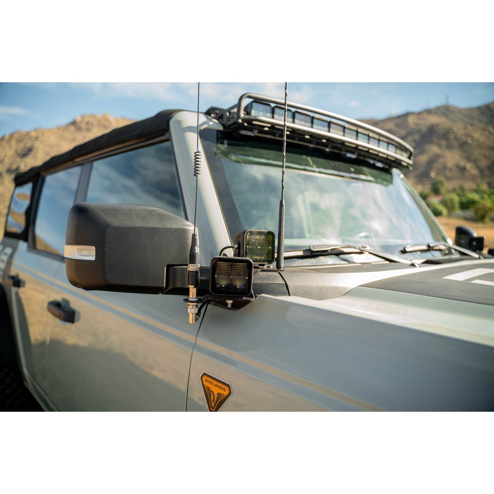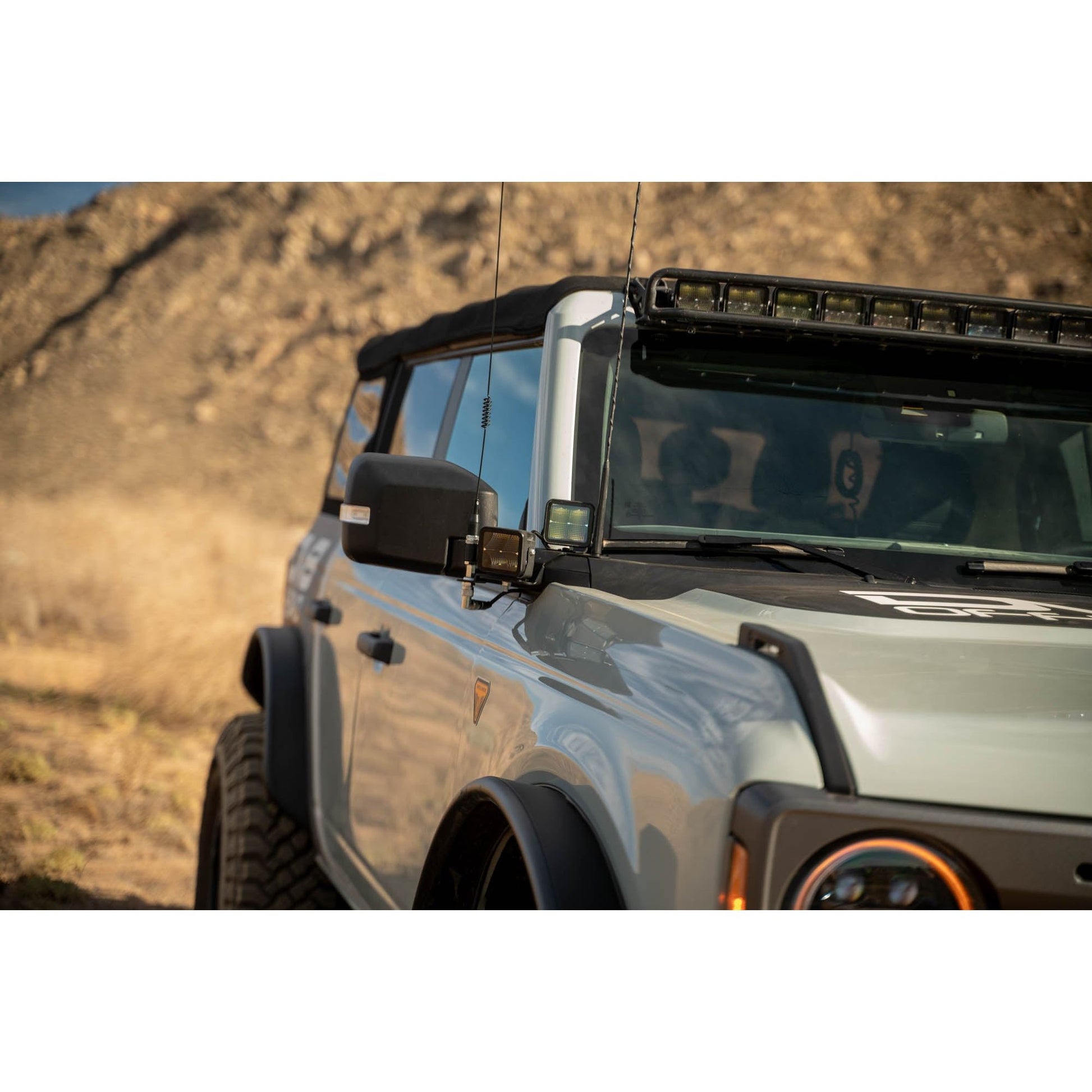 Our 6th Gen Bronco A-Pillar Dual Light Pod Drop Mounts provides options to mount (2) 3-inch light pods on each side of the Bronco. The top light mounting point is perfect for forward-facing or angled lighting. The drop mounting point is great for either forward-facing or side ditch lighting - perfect for dark trail conditions. The brackets sit in a low-profile position to keep the pod lights out of your sightline. Each side has provisions for mounting an antenna or whip flag.