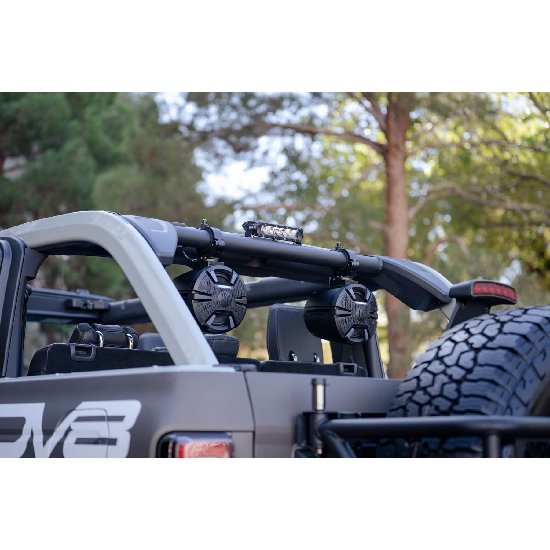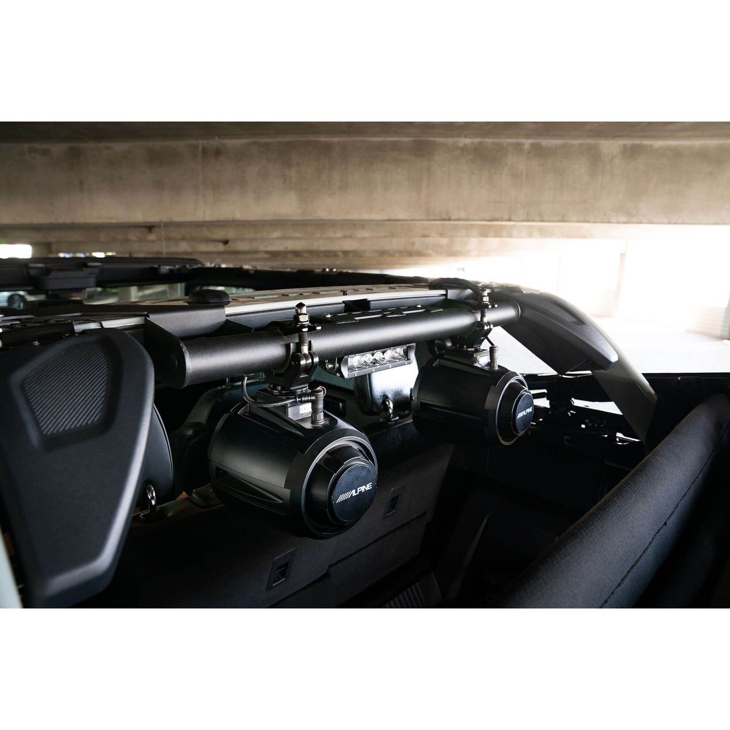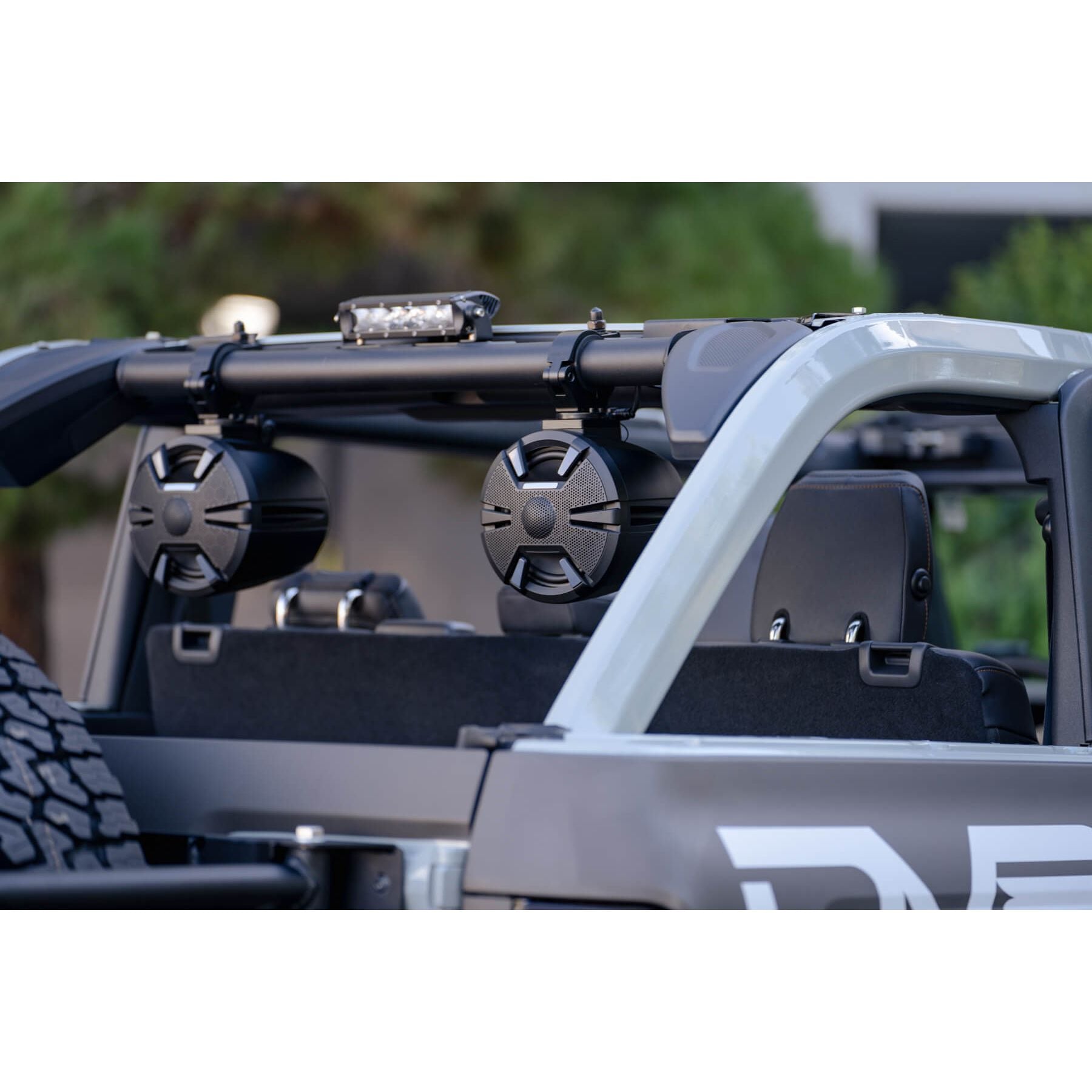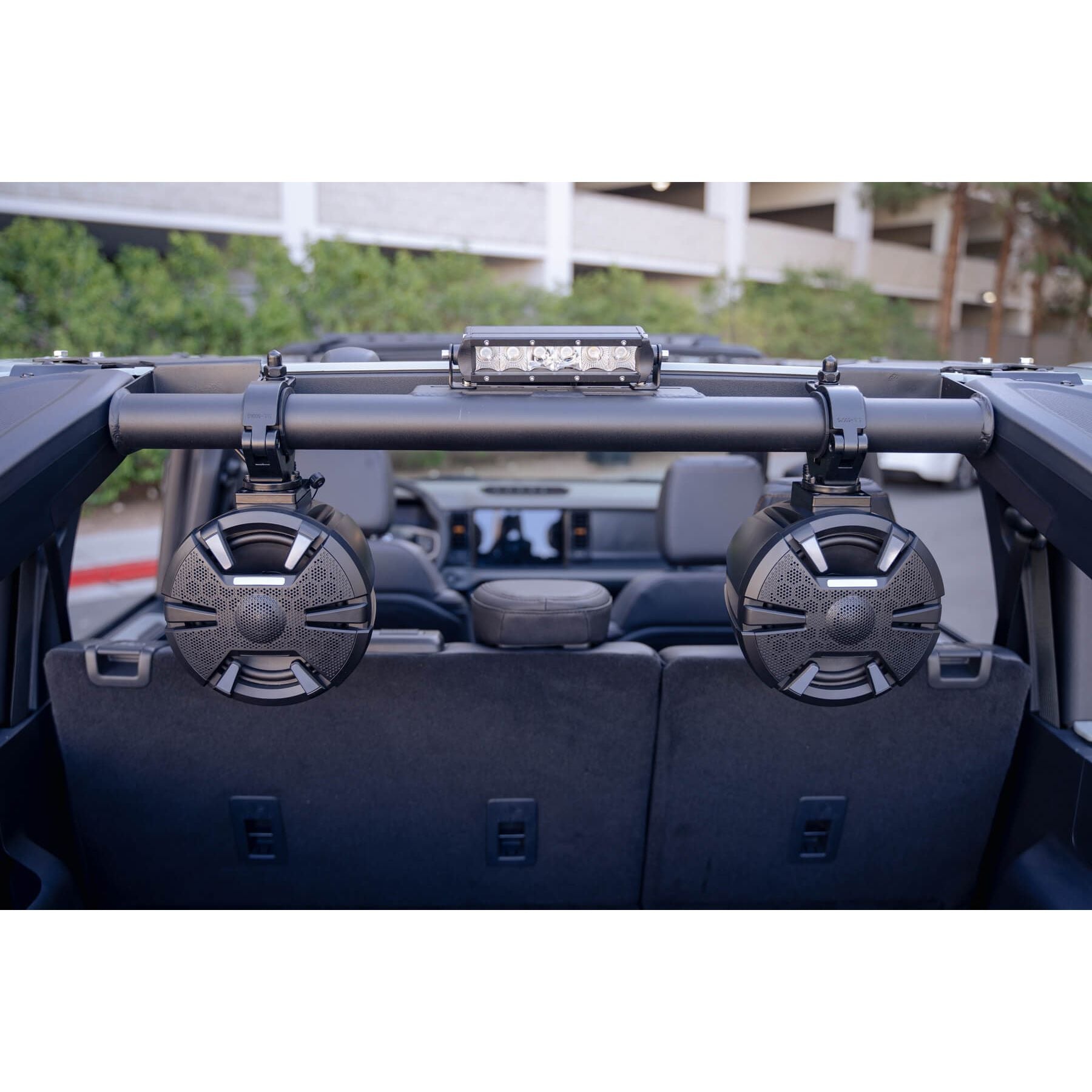 This crossbar was designed to provide your Bronco additional mounting options for rear facing LED lights and speaker cans, or a speaker bar. It mounts directly to OEM locations with provided hardware, and is functional with your hard or soft top on or off.