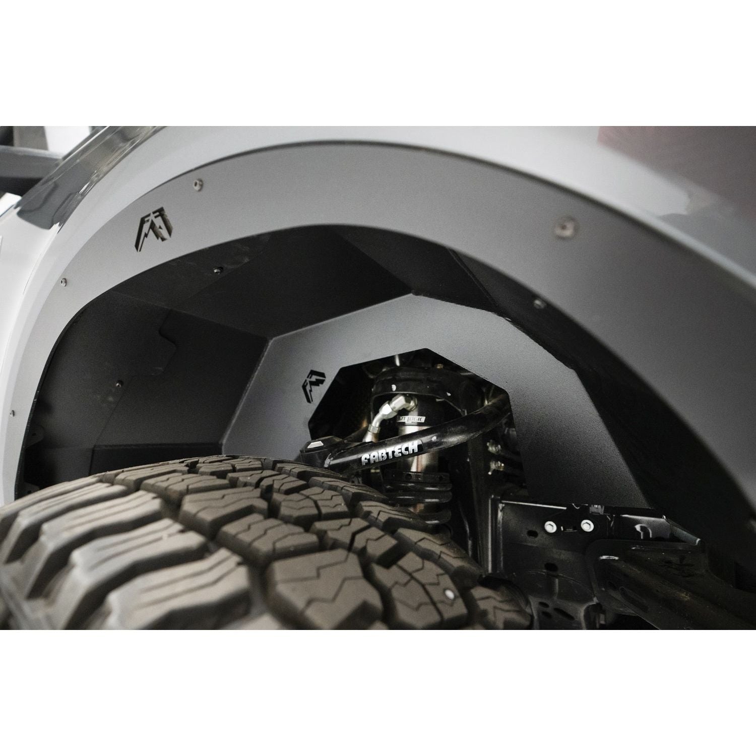 Add style and protection with Fab Fours Front Inner Fenders for your Ford Bronco. Made from 12 gauge US steel construction and available in our 2 Stage Matte Black Powder Coat w/ epoxy primer. These front inner fenders will fit with OE Fenders and Fab Fours Fenders for the Ford Bronco. Fab Fours - Made in the USA!