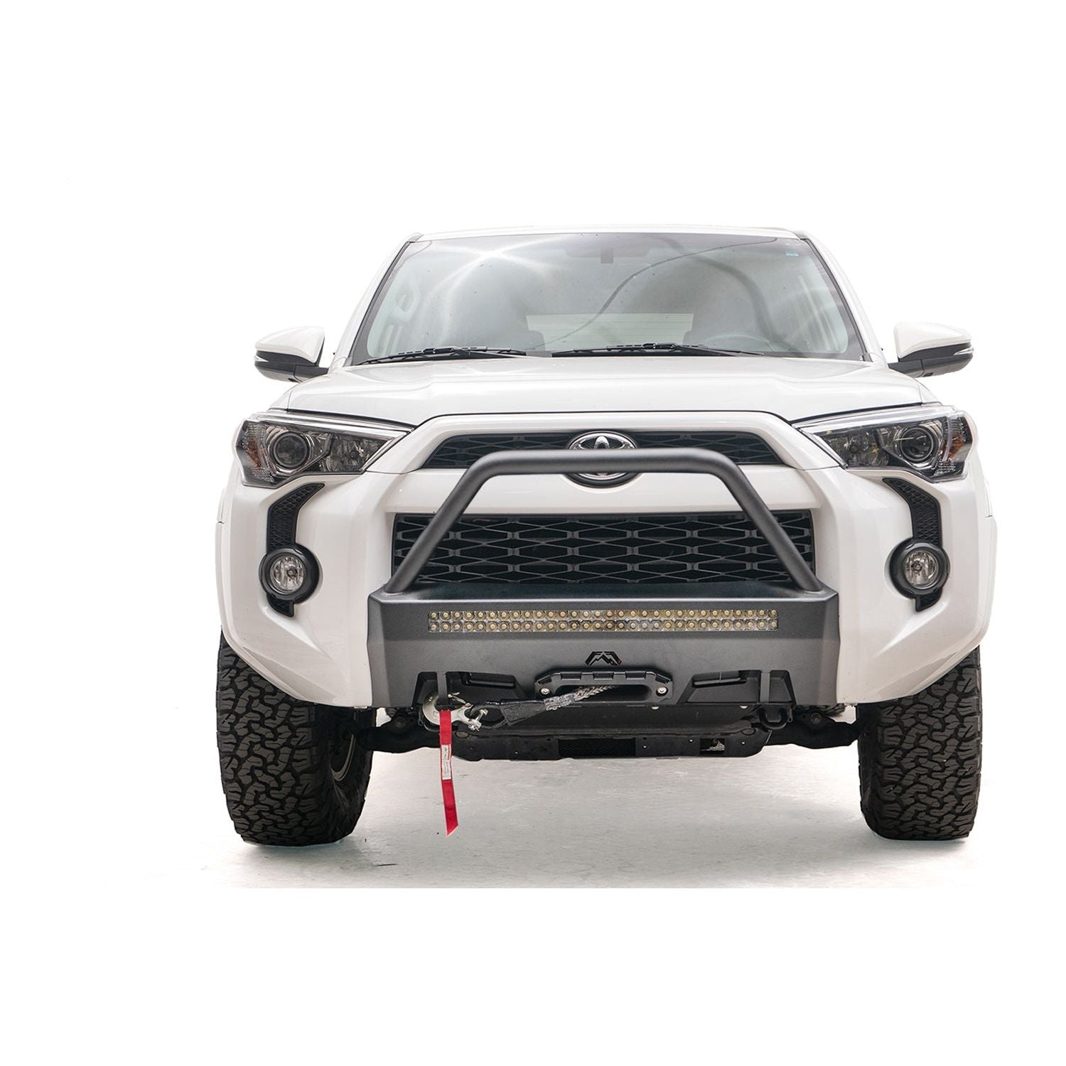 The perfect combination of form and function. The Fab Fours' Hidden Winch Mount for the 5th Gen Toyota 4-Runner was made for the ultimate adventurous spirit. Key features include Winch-ready design; integrated d-ring mounts; retains factory tow hooks, and integrated 30? LED light bar housing, higher pre-runner guard allows for ACC (automatic cruise control) function. Always Made in the USA!