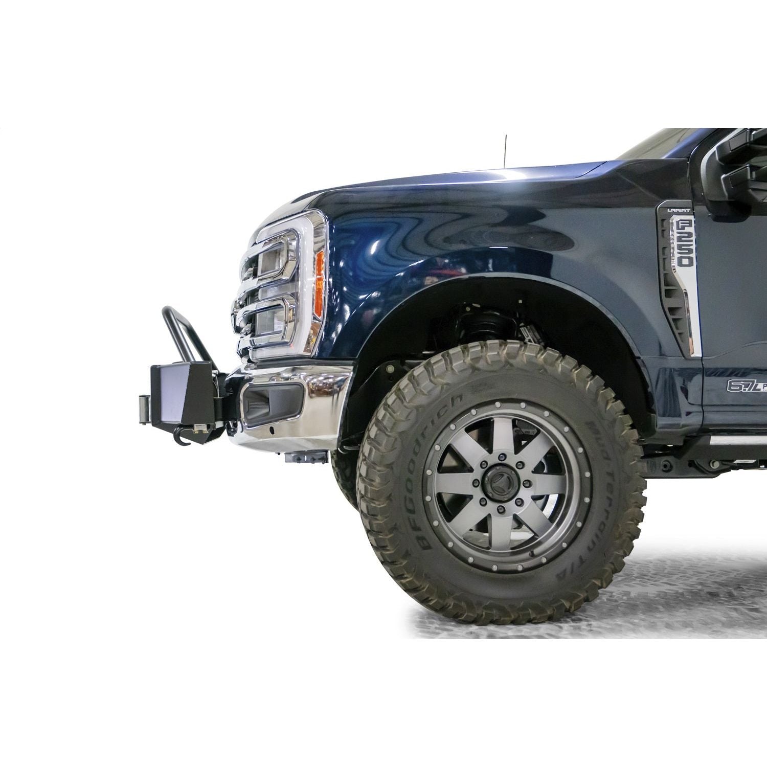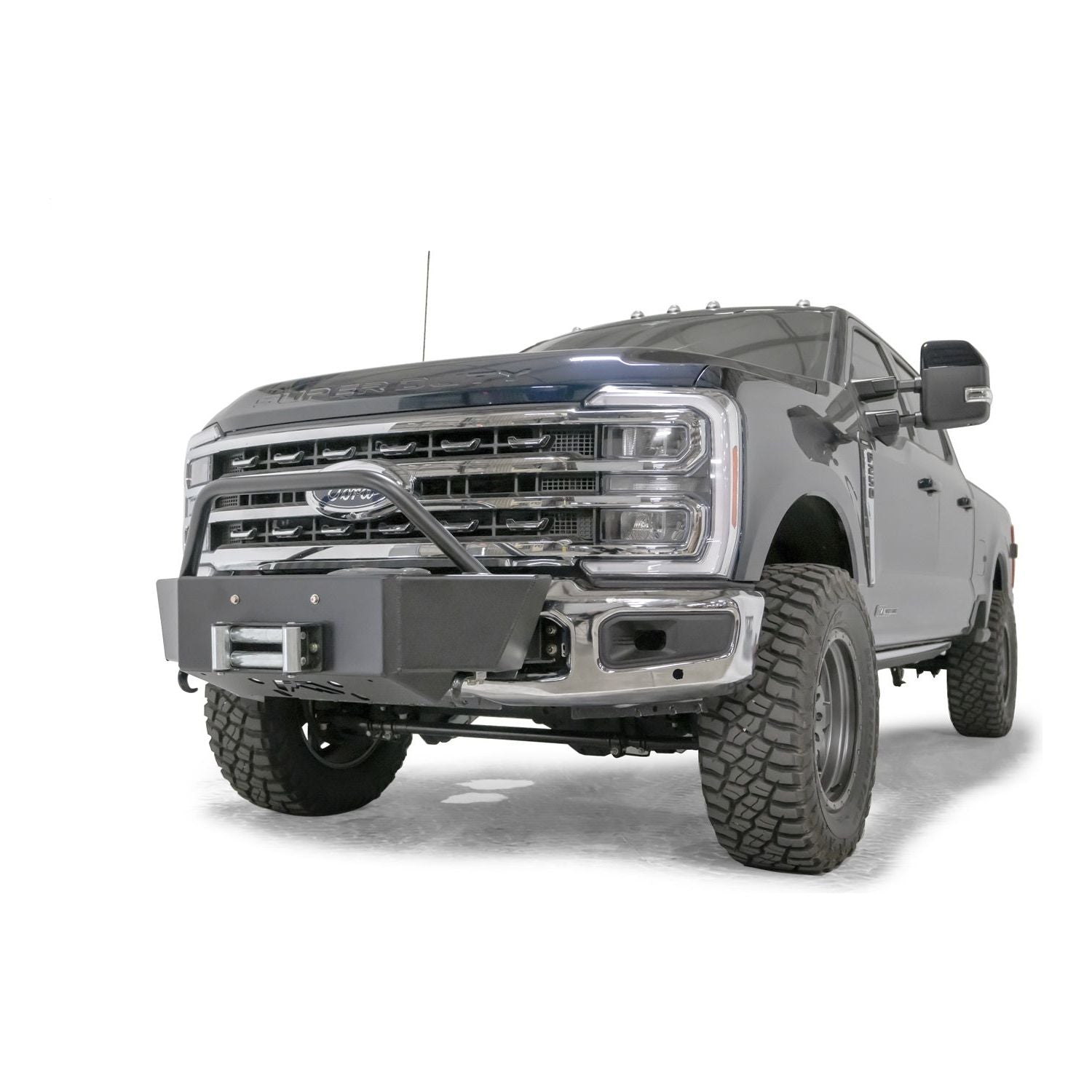 The perfect combination of form and function - The Fab Fours' Winch Mount w/ Pre-runner Guard for the 2023 Ford Super Duty focuses on strength and durability. This one piece fully welded Winch Mount is easy to install; simply slip it through the factory tow hooks slots straight to the frame. Able to hold up to a 16.5K winch, includes bolt-on tow-hooks and is constructed out of 1/4th inch US steel. Fab Fours - Made in the USA!