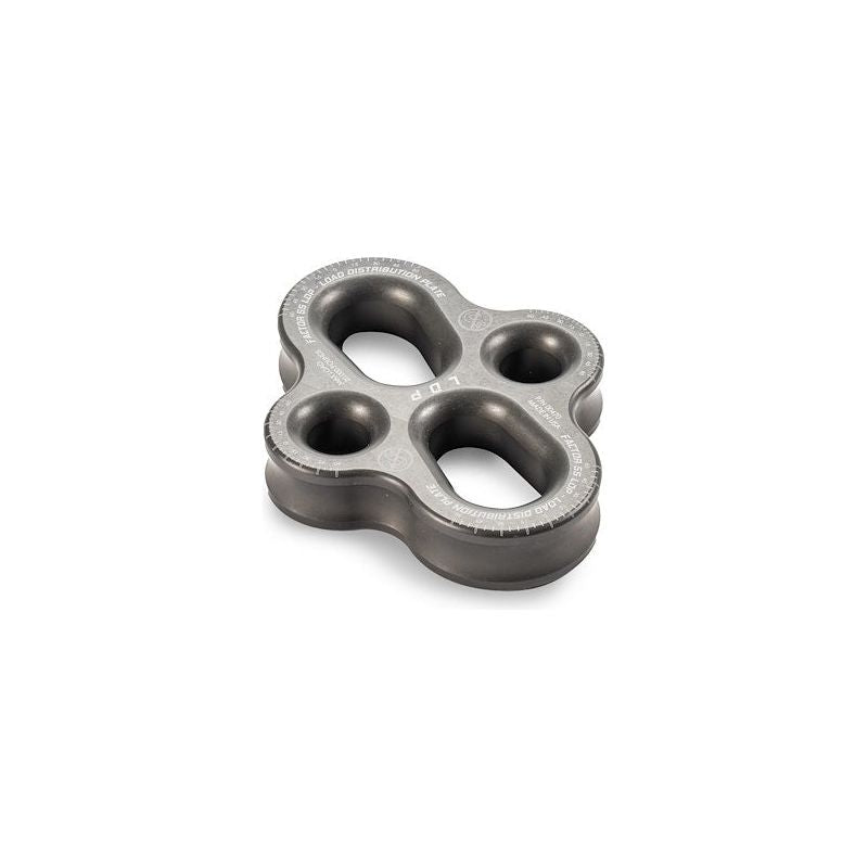 Rigging plate designed for distribution of multiple loads and directions. Safe collection point for multiple winching applications. Prevents collecting multiple loads on a single shackle. Self-aligning shackle pin holes fit common 3/4 inch shackles. Pear shaped holes permit 3/4 inch and 7/8 inch shackle bodies to pass through.