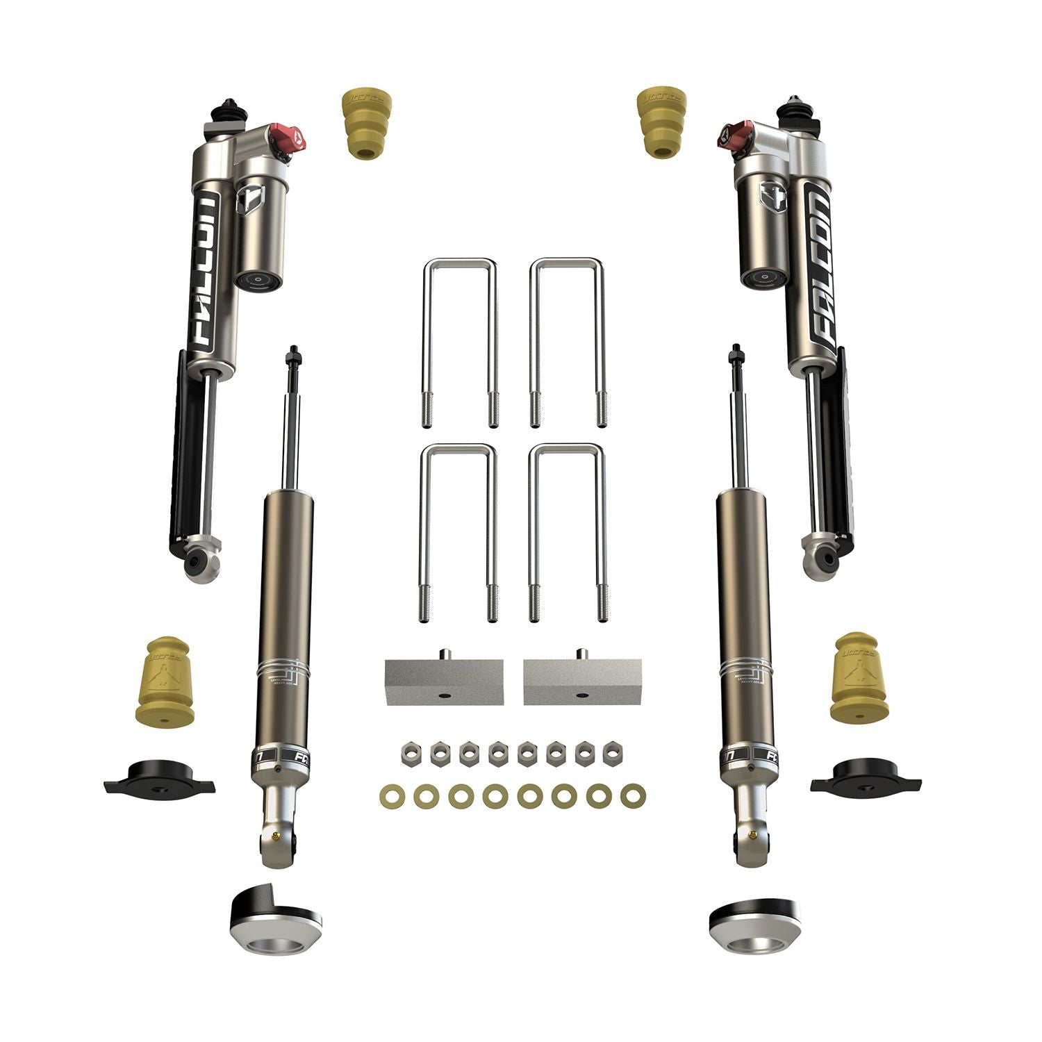 The versatility of these systems makes them ideal for daily driving, off-road excursions, and tow/haul duties. Falcon Shock & Spacer Lift Systems provide additional rear travel and ride height.