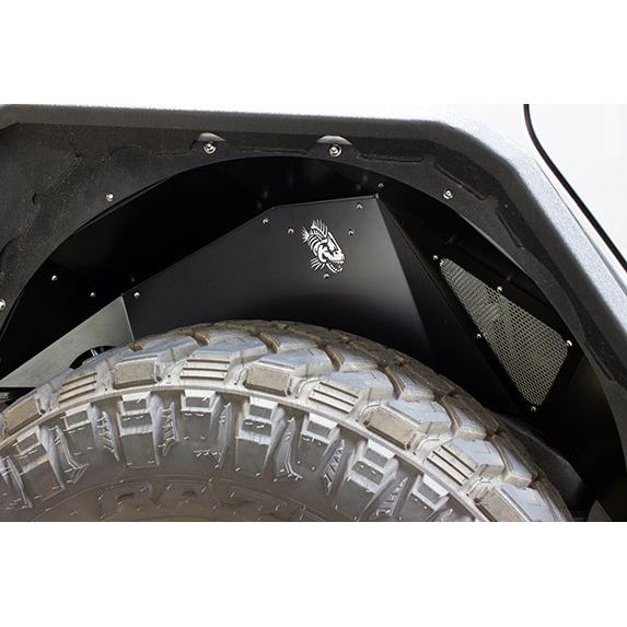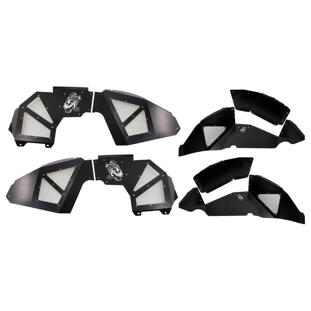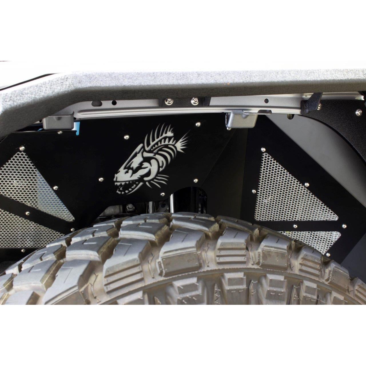 Features: Fits 2018 to Current JL Wrangler, Rubicon and Unlimited 2 and 4-Door Models Made from Black Powder Coated Aluminum Fishbone logo laser cut on all 4 inners Front and Rear Inner Fender These are only the inner panels Removable Cooling Vents and Accent Plates for Custom Paint Set of 4