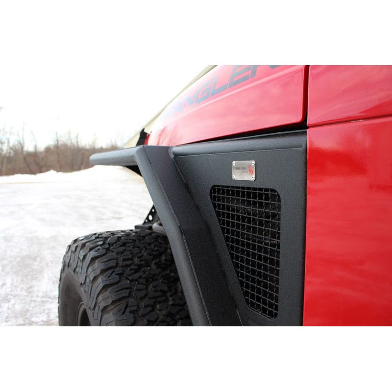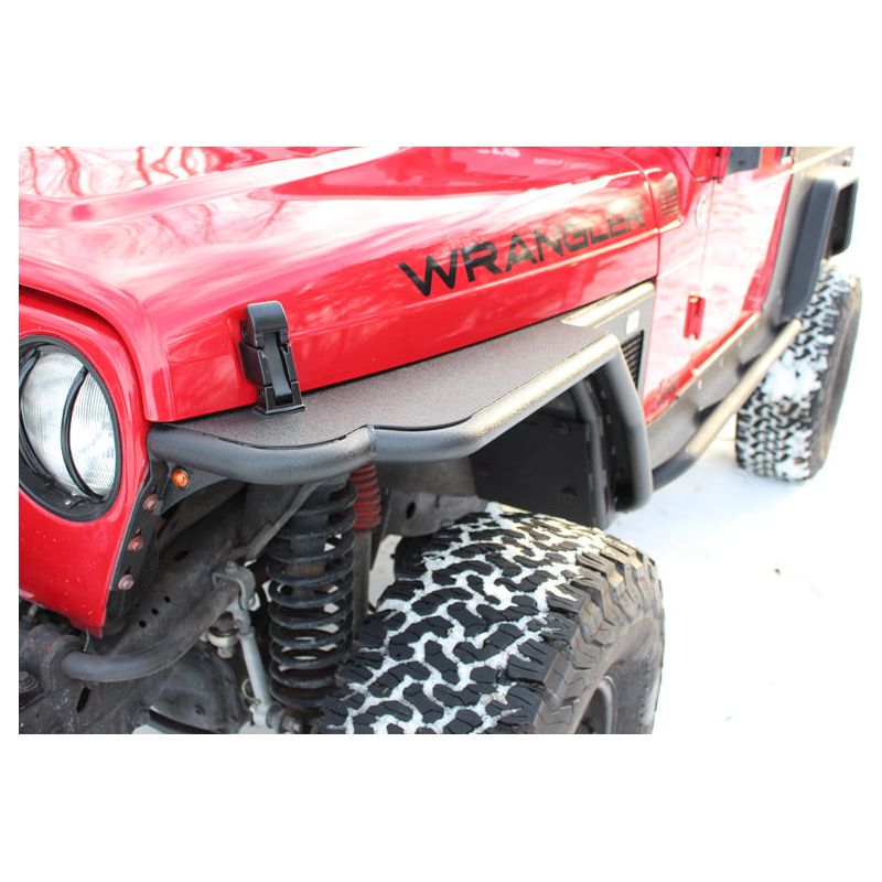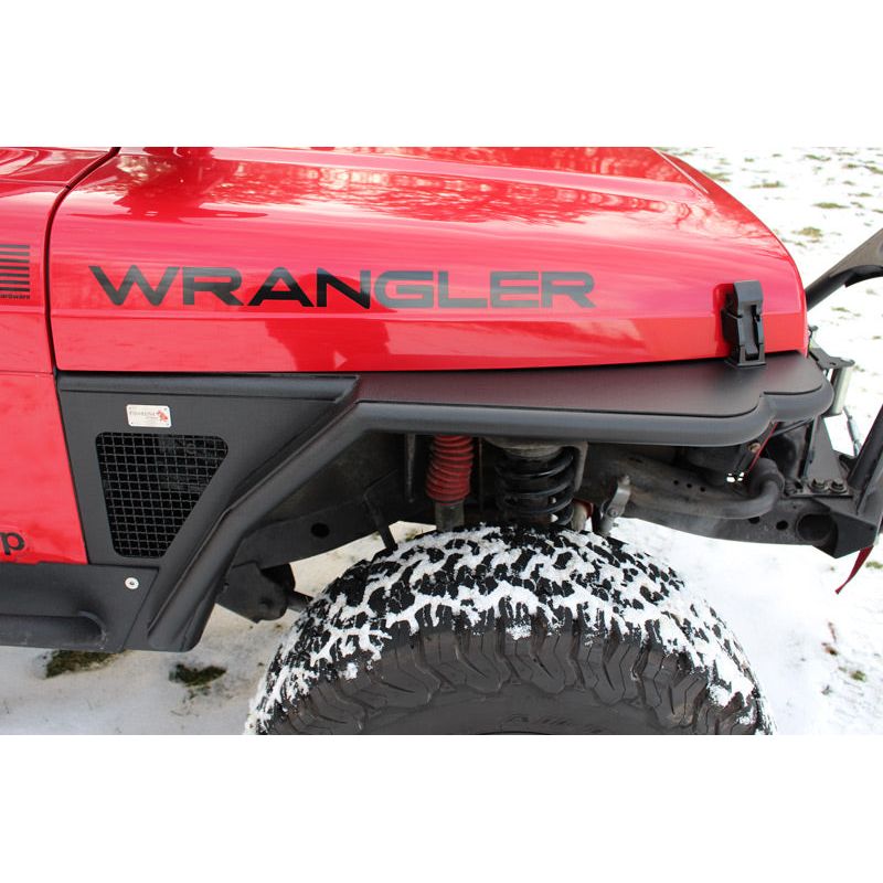 The Fishbone Offroad Front Tube Fenders includes a pair of Tube Fenders that have a perforated side panel to allow your TJ to release under hood heat. Fenders are made from steel and are powder coated black for a clean look.