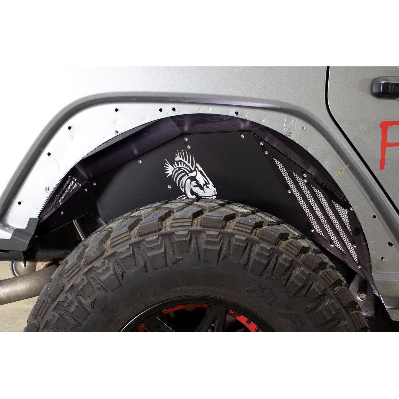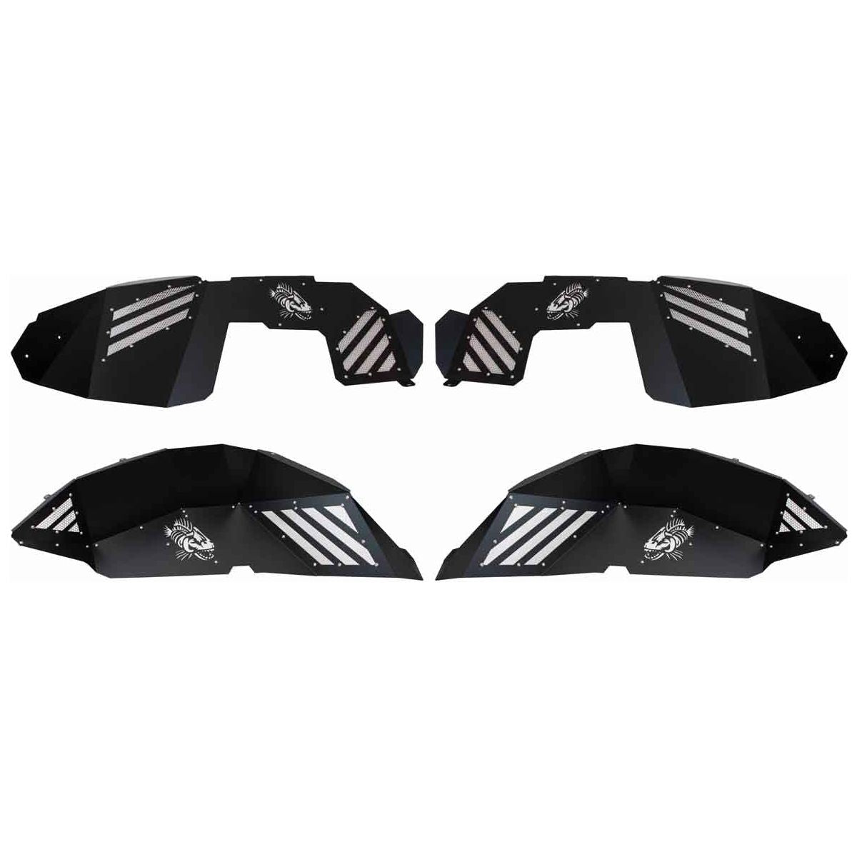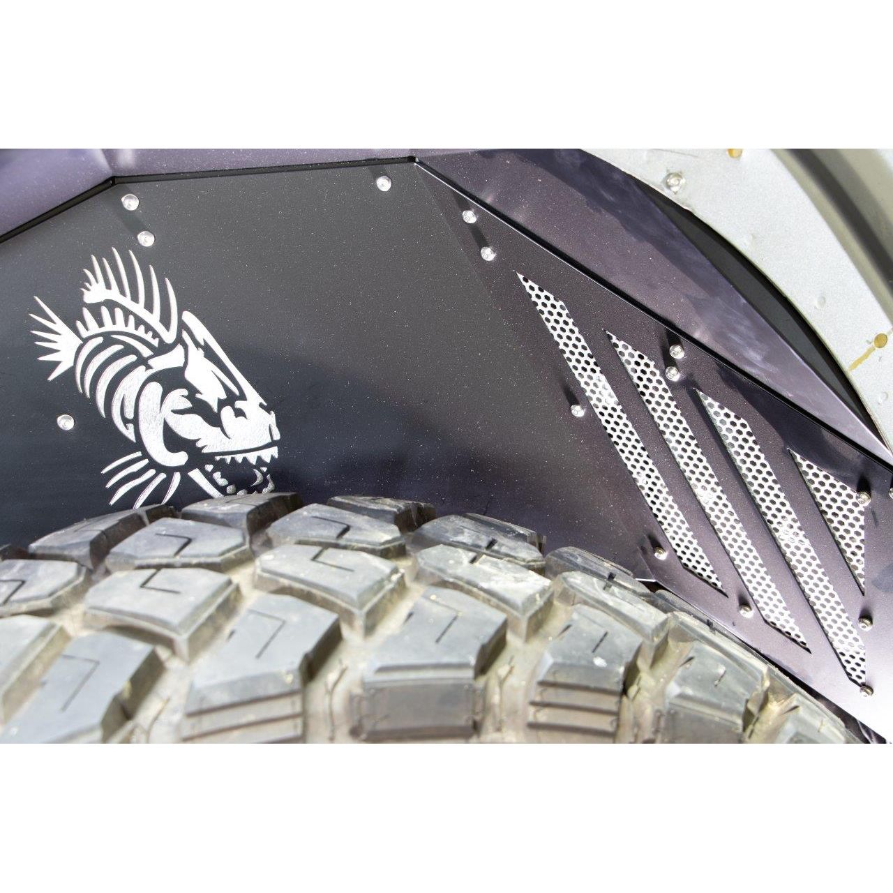 Each set includes both front and rear inner fenders, laser cut with the iconic Fishbone logo on all four panels, adding a distinctive and personalized touch to your vehicle's undercarriage. The innovative design features removable cooling vents and accent plates that can be custom-painted to match your Jeep's unique style.