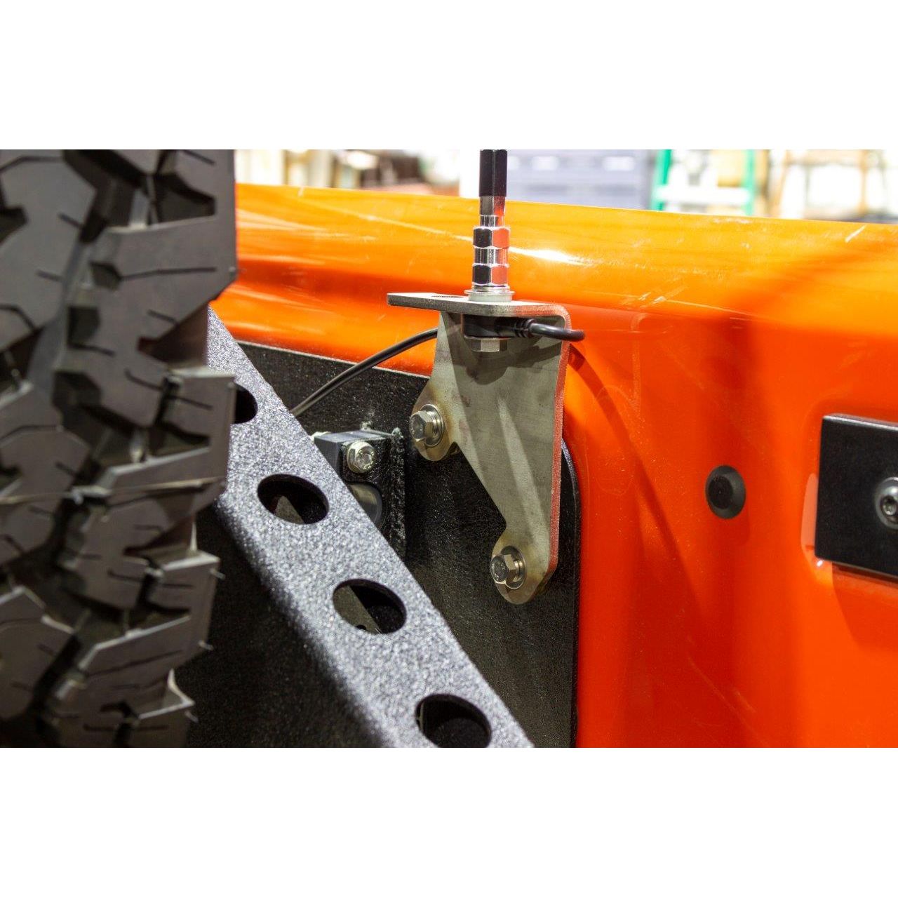 Give your CB Antenna the protection it deserves by securing it the rear of your JK! Other eyesore mounts fix to the front of your vehicle for all to see. Our stainless steel Antenna Mount and hardware fits onto your tailgate behind your factory tire carrier or on most backsides!