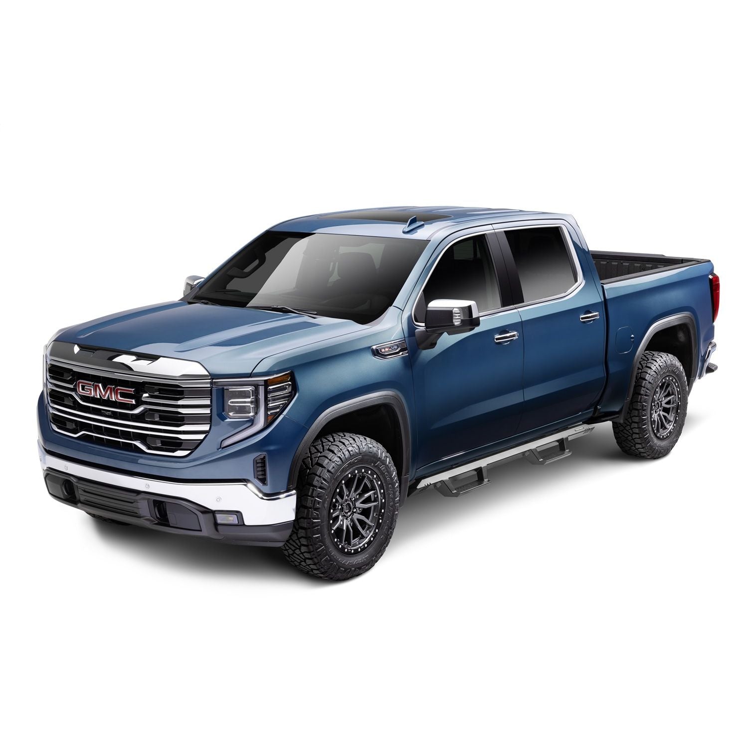 EpYx Step System-Cab Length (2 Steps per Side)-2019 (New Body Style)-2024 Chevy Silverado/GMC Sierra 1500/2020-2024 2500 HD/3500 HD Crew Cab-Textured Black | The EpYx drop down step provides a sleek and polished aesthetic to your vehicle. The expanded step plate offers the ultimate ease of access to any vehicle. Angular steel construction offers long lasting durability and strength for all of your vehicle needs. All new modular brackets make installation quick and easy. | 5 year Finish Warranty; Lifetime Workmanship Warranty