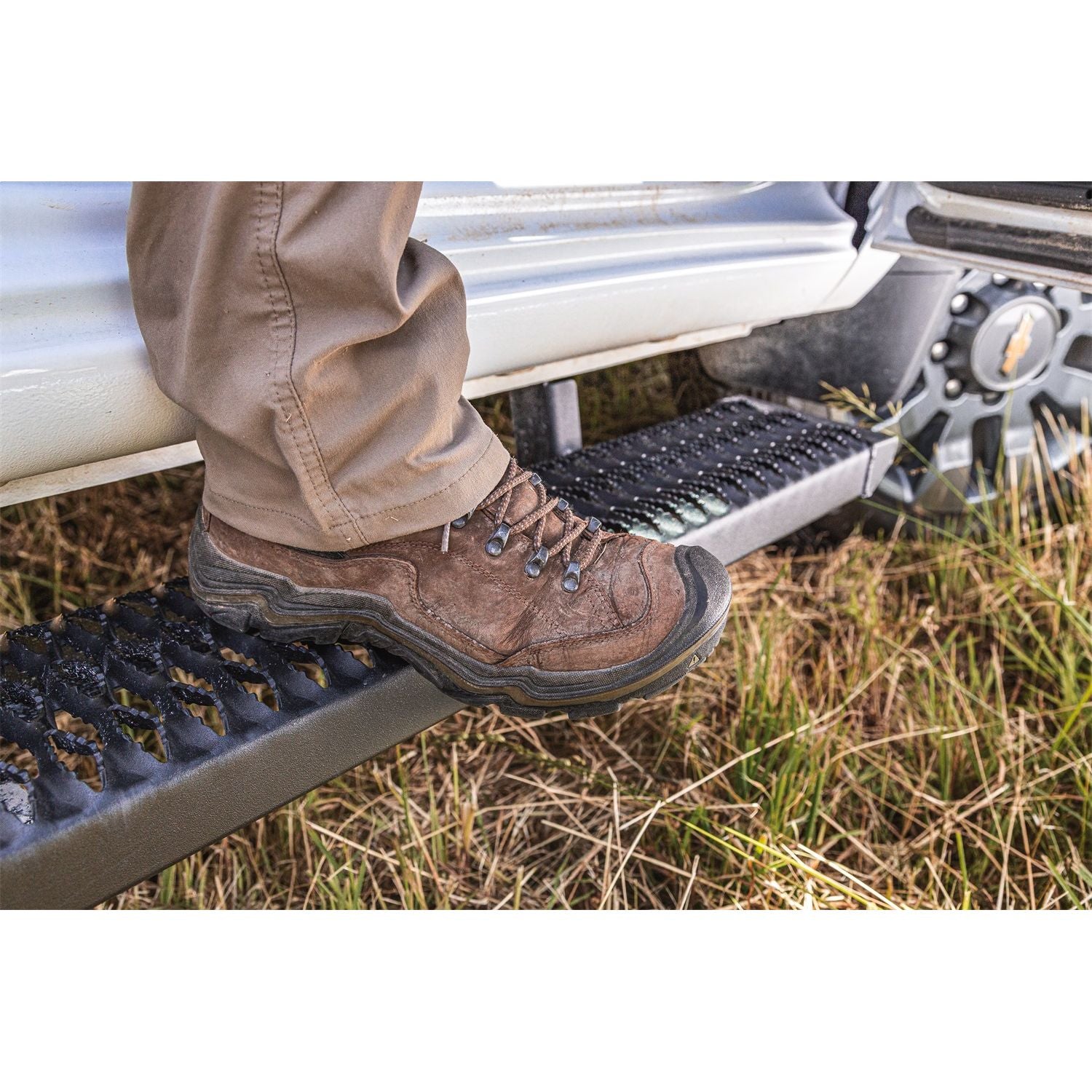 Growler Step System-Cab Length (1 Step per Side)-7 in. Board-2019 (New Body Style)-2024 Chevy Silverado/GMC Sierra 1500/2020-2024 2500 HD/3500 HD Double Cab-Textured Black | The Growler running board provides a clean yet aggressive look your vehicle. The Sure Grip tread design allows for ultimate traction in any condition. All aluminum construction with modular steel brackets offers long lasting durability and strength for all of your vehicle needs. Bolt-on brackets make installation quick and easy. This is a convenient option for work truck and fleet solutions. | 5 year Finish Warranty; Lifetime Workmanship Warranty