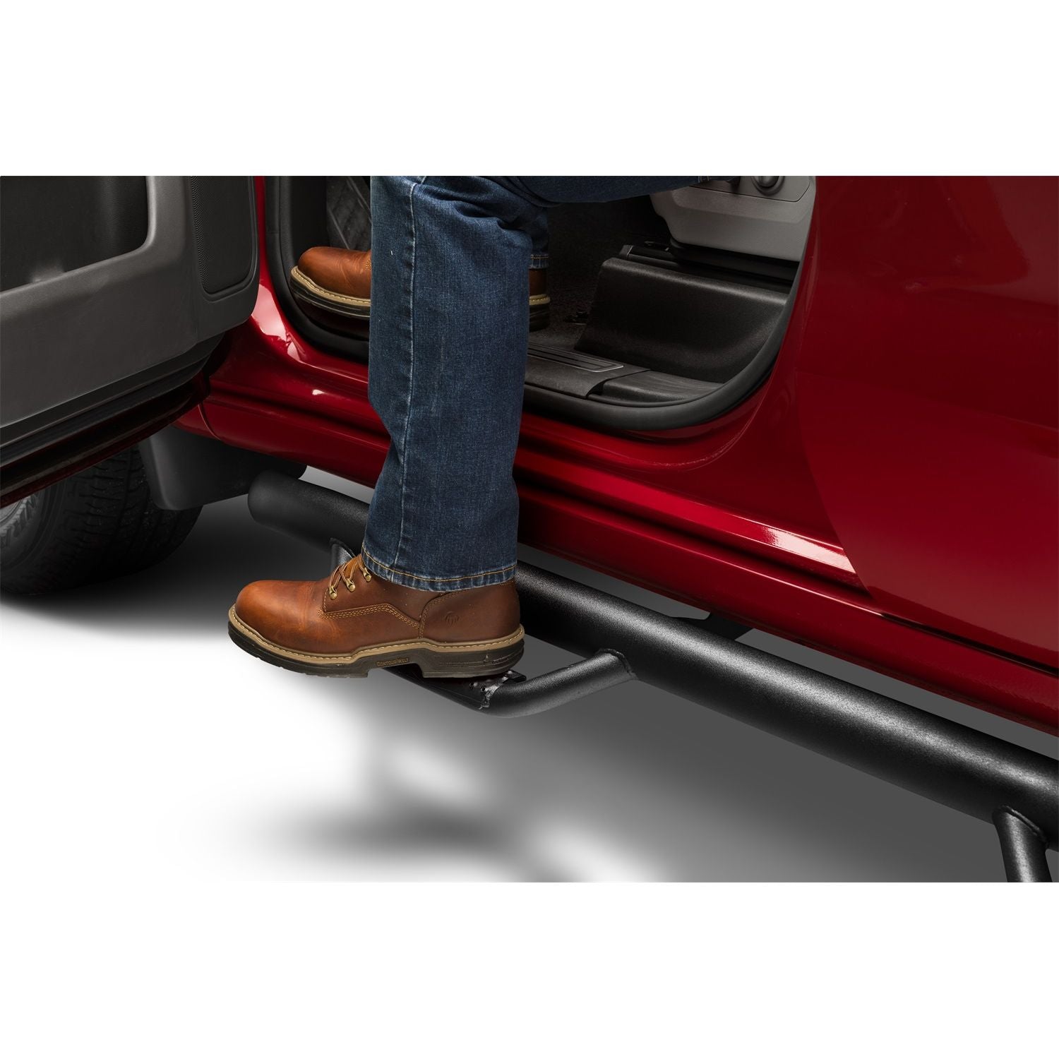 Nerf Step Bar-Cab Length (2 Step per Side)-2019 (New Body Style)-2024 Chevy Silverado/GMC Sierra 1500/2020-2024 2500 HD/3500 HD Double Cab-Textured Black | Built with today's work truck in mind, N-FAB offers its patented hoop step design and innovative mounting system in a Cab Length configuration. Designed with classic N-FAB styling, Cab Length Nerf Steps are ideal for flat bed trucks, stake bed trucks, vehicles with campers, and even trucks with side exhaust forward of the rear wheels. Manufactured from .084 wall tubular steel, Cab Length Nerf Steps provide all of the strength and durability for which N-FAB is known. All Nerf Steps have a 5 year Finish and Lifetime Workmanship Warranty. | 5 year Finish Warranty; Lifetime Workmanship Warranty