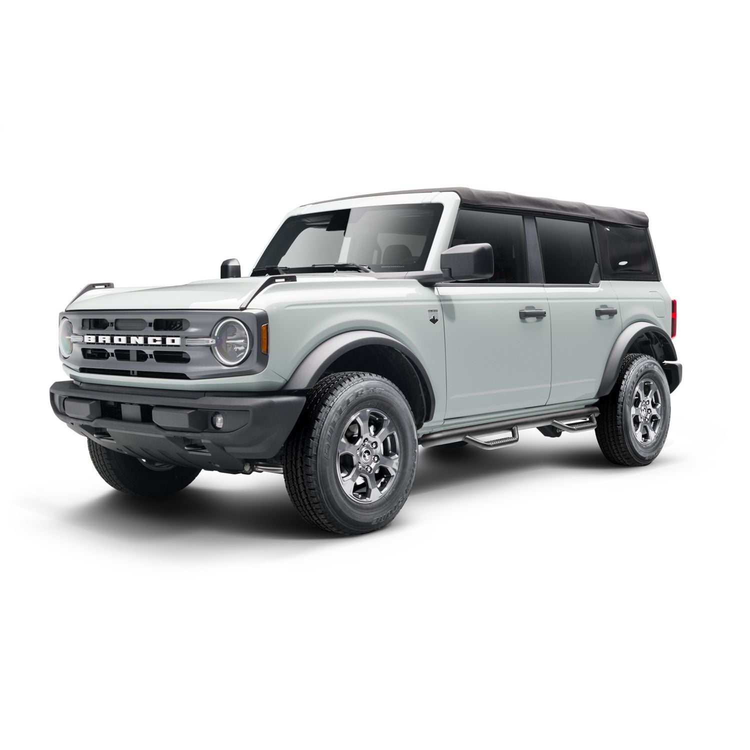 Nerf Step Bar-Cab Length (2 Steps per Side)-21-24 Ford Bronco 4 Dr-Textured Black | Built with today's work truck in mind, N-FAB offers its patented hoop step design and innovative mounting system in a Cab Length configuration. Designed with classic N-FAB styling, Cab Length Nerf Steps are ideal for flat bed trucks, stake bed trucks, vehicles with campers, and even trucks with side exhaust forward of the rear wheels. Manufactured from .084 wall tubular steel, Cab Length Nerf Steps provide all of the strength and durability for which N-FAB is known. All Nerf Steps have a 5 year Finish and Lifetime Workmanship Warranty. | 5 year Finish Warranty; Lifetime Workmanship Warranty