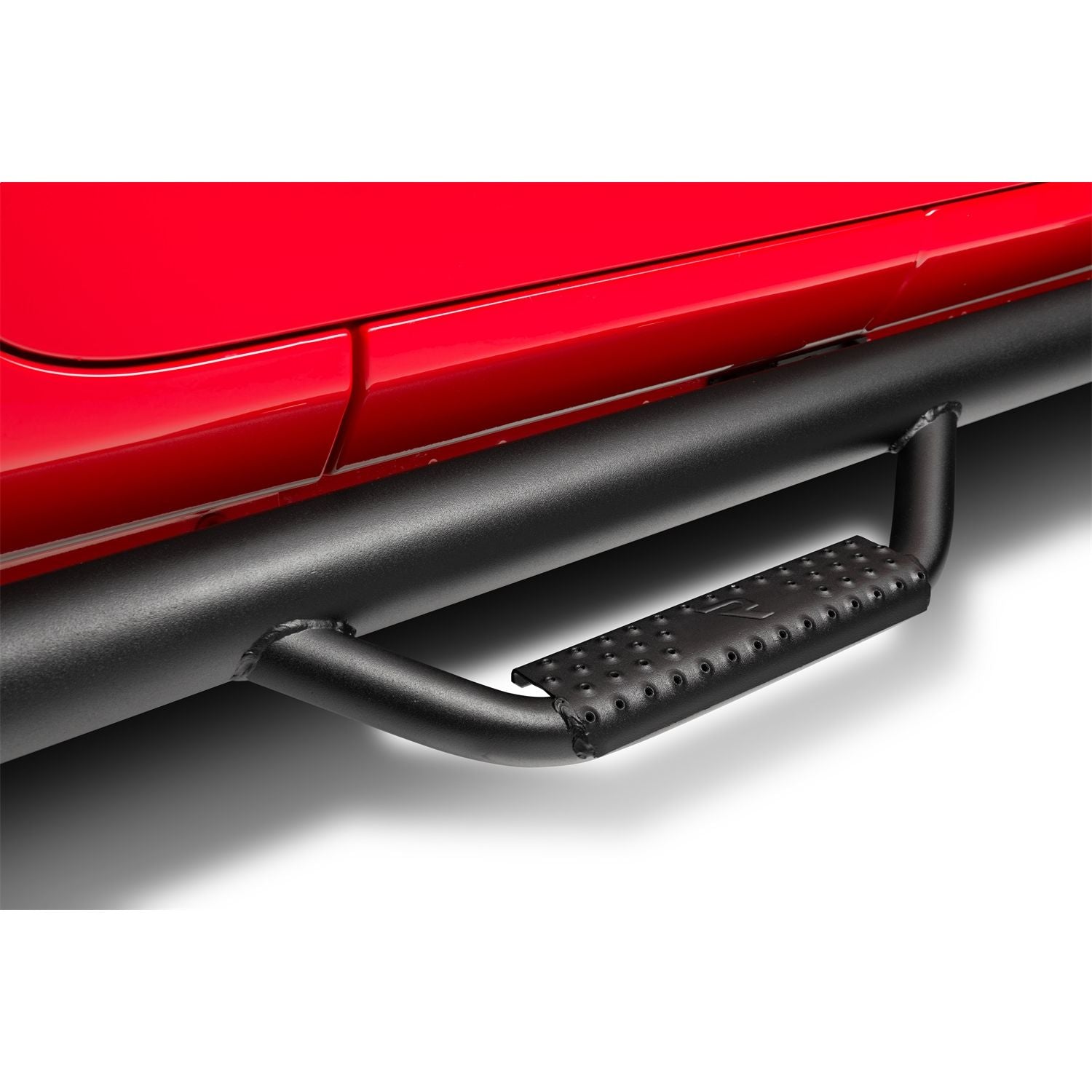 Nerf Step Bar-Wheel-to-Wheel (2 Steps per Side)-3 in. Main Tube Diameter-2007-2018 Jeep Wrangler JK 4-Door-Textured Black | One of N-FAB's most popular styles is the Wheel to Wheel Nerf-Step. Utilizing N-FAB's patented hoop step design and innovative mounting system, N-FAB Wheel to Wheel Nerf Steps work on vehicles with and without body lift kits, with no modifications to brackets or bars. All N-FAB Wheel to Wheel Nerf Steps are built using .084 wall steel tubing and offer an industry high load rating of 465 pounds. All N-FAB Wheel to Wheel Nerf Steps are constructed as one-piece assemblies to provide maximum strength and durability not found in modular designs. Wheel to Wheel Nerf-Steps are designed and built specifically for each application, and mount high and tight to the vehicle cab for a clean factory look. | 5 year Finish Warranty; Lifetime Workmanship Warranty