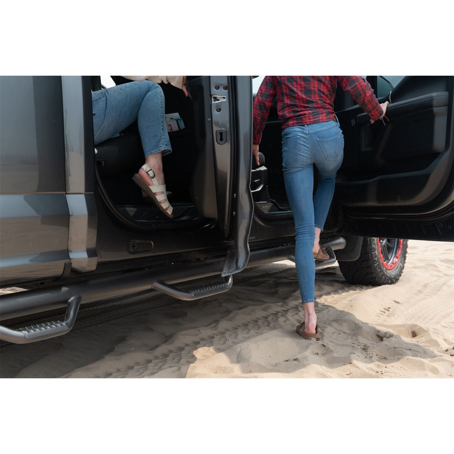 Nerf Step Bar-Wheel-to-Wheel with Bed Access (3 Steps per Side)-3 in. Main Tube Diameter-2015-2024 Ford F-150 5ft. 7in. SuperCrew-Textured Black | One of N-FAB's most popular styles is the Wheel to Wheel Nerf-Step. Utilizing N-FAB's patented hoop step design and innovative mounting system, N-FAB Wheel to Wheel Nerf Steps work on vehicles with and without body lift kits, with no modifications to brackets or bars. All N-FAB Wheel to Wheel Nerf Steps are built using .084 wall steel tubing and offer an industry high load rating of 465 pounds. All N-FAB Wheel to Wheel Nerf Steps are constructed as one-piece assemblies to provide maximum strength and durability not found in modular designs. Wheel to Wheel Nerf-Steps are designed and built specifically for each application, and mount high and tight to the vehicle cab for a clean factory look. | 5 year Finish Warranty; Lifetime Workmanship Warranty