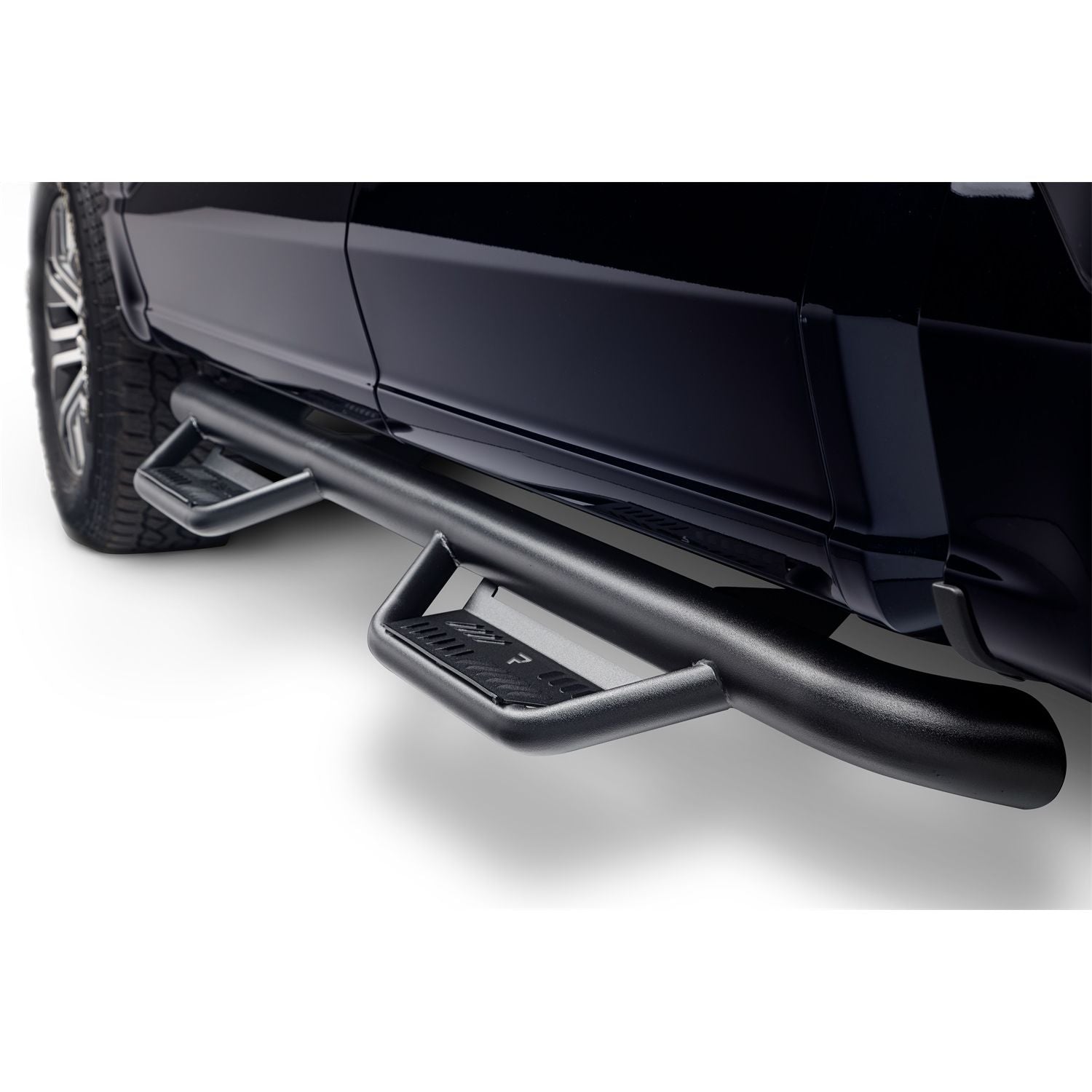 Podium Step LG-Cab Length (2 Steps per Side)-3 in. Main Tube Diameter-2015-2024 Ford F-150/2017-2024 Raptor Super Crew/2017-2024 F-250/F-350/F-450 Crew-Textured Black | Patented N-FAB hoop step design featuring an all-new expanded and enclosed sure-grip step plate. With a 3 in. main tube diameter, this application fits high and tight to the vehicle body for a clean modern style. Fully welded 1-piece construction for strength, long lasting durability and ease of installation! Created from Stainless Steel construction. Drop down step design and location is engineered to allow for ease of access on stock or lifted vehicles. Lifetime finish warranty on polished stainless steel, 5 year finish warranty on textured black finish and lifetime craftsmanship warranty. For the ultimate vehicle access experience in any condition! | 5 year Finish Warranty; Lifetime Workmanship Warranty