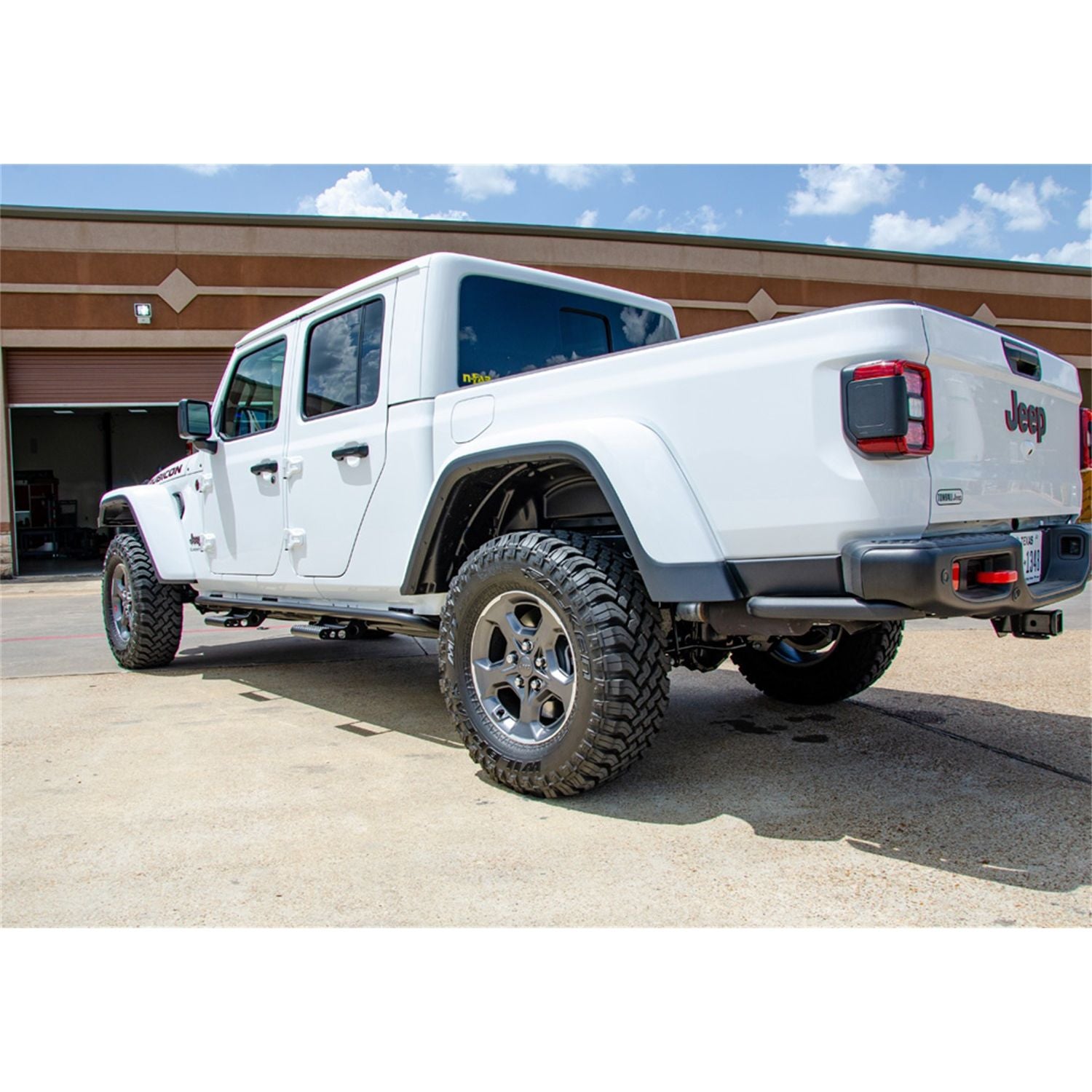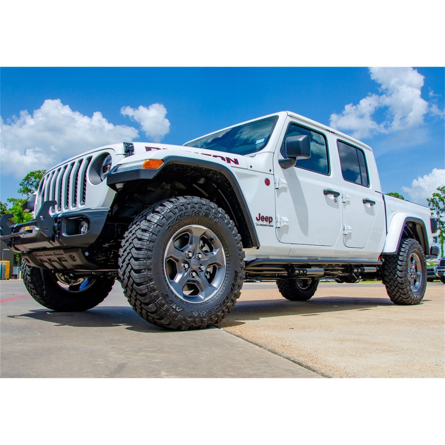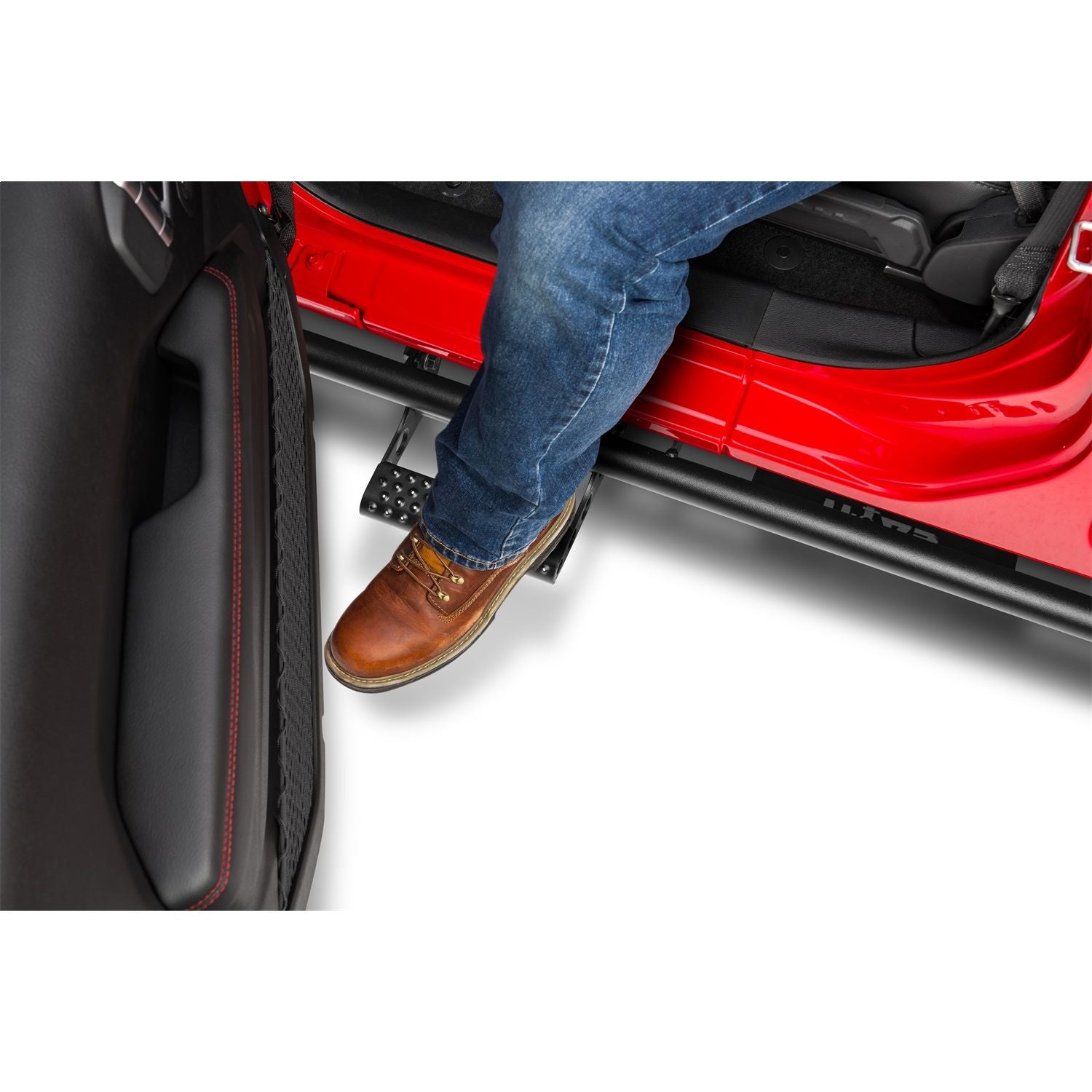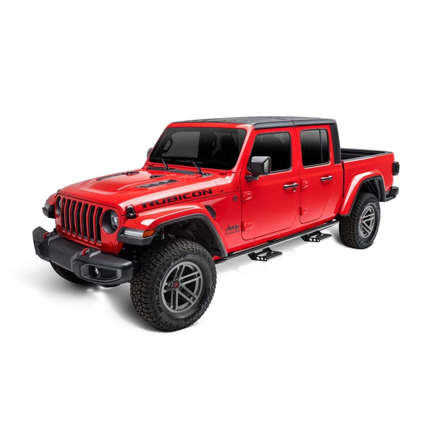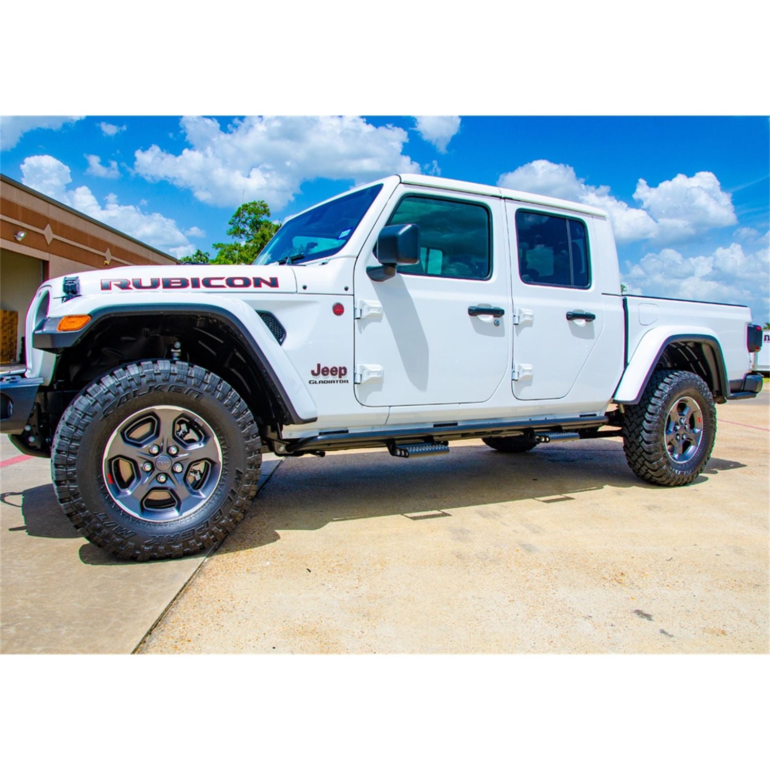 RKR Step System-Full Length (1 Step Mount/1 Step per Side)-1.75 in. Rails-2020-2024 Jeep Gladiator JT 4-Door-Textured Black | N-FAB RKR Rails Provide superior protection while enhancing the look of the vehicle. Constructed using 0.12 in. wall, 1.75 in. tubular steel, RKR Rails are treated inside and out for extra corrosion resistance so you know they are built to last. Finished with a durable textured black powder coat, N-FAB RKR Rails look as good as they perform both on and off-road. Making a great product even better, N-FAB offers optional Detachable Steps that are compatible with all N-FAB RKR Rails and Factory Toyota FJ Rock Rails. These steps offer convenient vehicle access for daily use and can be removed to allow for maximum group clearance when off-road. | 5 year Finish Warranty; Lifetime Workmanship Warranty
