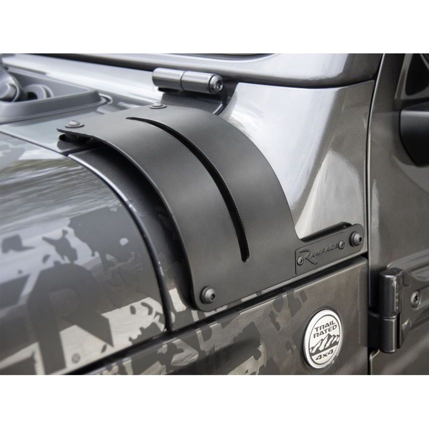 The new Rampage steel cowl light mount not only protects the factory plastic cowl, but it also offers some options! It features an adjustable light slot for mounting and positioning the light in multiple positions, and even provides for the windshield to fold down flat. Lights are not included as it is a universal mount, and any light brand can be used.