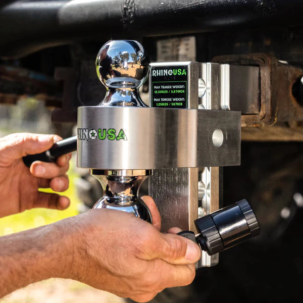 Built to withstand the toughest towing tasks, this drop hitch is constructed with high-quality materials that ensure exceptional strength and durability. Engineered to handle heavy loads, it provides the reliability and stability you need when towing large trailers, boats, or recreational vehicles. The Rhino USA adjustable drop hitch allows you to tow between 8,000 and 12,500 pounds!