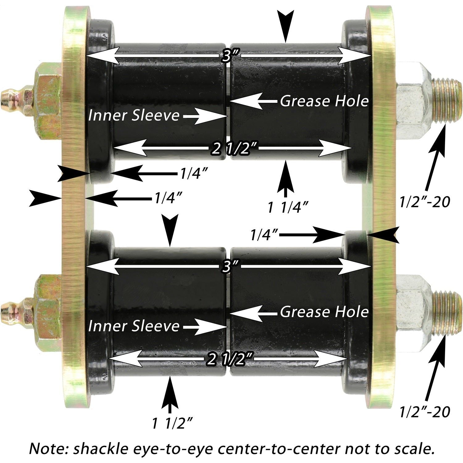 VEHICLE FITMENT: YJ 1987-1995 I RockJocks greasable front tow shackles for 1987-1995 Jeep YJ Wrangler vehicles directly replace the stock shackles with our new, heavy duty units. Our shackles feature laser cut, 1/4 "thick steel side plates, Energy Suspension fluted urethane bushings to fit ProComp springs, grade 8 greasable bolts that feature zerk fittings on their heads for greasing of the bushings, and center bolt-in sleeves for added rigidity. Additionally, our tow shackles feature for quick-disconnect mounting of common tow bars! Shackles are 4 1/4 "tall from bolt center to bolt center. Finished in corrosion proof gold zinc plating and sold in pairs. Tow bar connecting pins and clips included!
