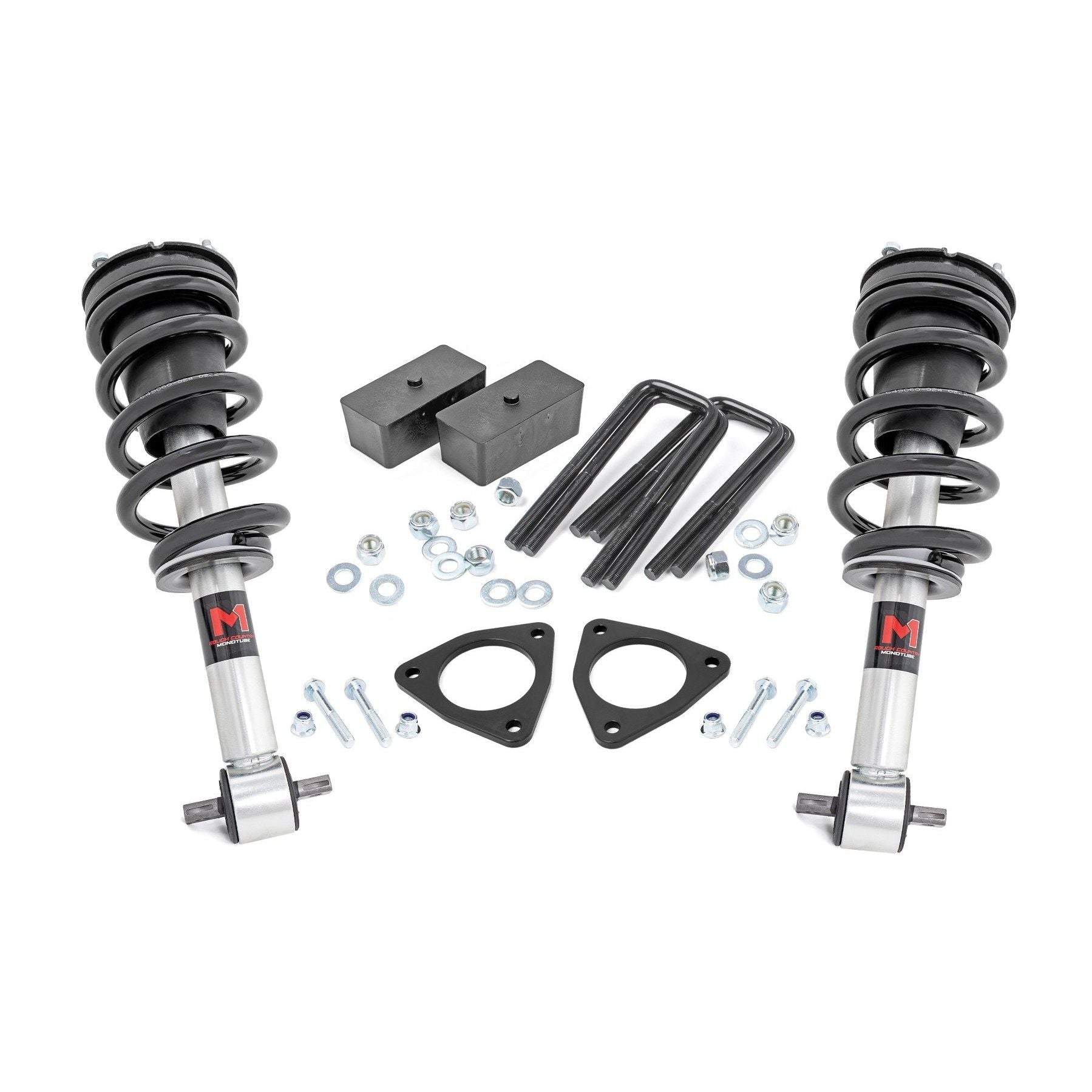 Lift Your Limits Without Breaking the Bank: Rough Country's 2.5-inch Suspension Lift Kit for Chevy Silverado or GMC Sierra 1500 pickups delivers off-road capability and clean street styling-without the high price tag. Designed for those who want more than a basic leveling kit, this system combines 2-inch lower strut extensions, strut spacers, and upgraded rear blocks for a true 2.5-inch lift-enough clearance to run up to a 285/70/17 tire with confidence.Preserve Factory Comfort with an Aggressive Stance: Maintain the smooth, factory-like ride you love while achieving a leveled front-to-rear look. Whether on the road or trail, this kit offers enhanced ground clearance with no compromise in handling or ride quality.Fully Configurable with Optional Strut Replacements: Choose the ride feel that suits your style-this kit is available with direct-fit replacement struts, including nitrogen-charged N3s or premium Vertex reservoir options. Whether you want a comfort-focused setup or performance-tuned damping, we've got you covered.Engineered for Strength, Built for Simplicity: Say goodbye to cast blocks-our upgraded 2-inch rear blocks are precision-crafted for durability and a secure, exact fit. With a fully bolt-on installation that requires no cutting, drilling, or strut compressor (excluding models equipped with lower stamped steel control arms), this kit installs quickly and easily in your own garage.Take on the Terrain with More Clearance and Control: Whether you're upgrading for style, clearance, or trail performance, Rough Country's 2.5-inch Lift Kit gives you the capability and stance your truck deserves-without the premium price. Preserves Factory Ride Comfort: Enjoy a smooth, factory-like ride with no compromise in handling or performance.